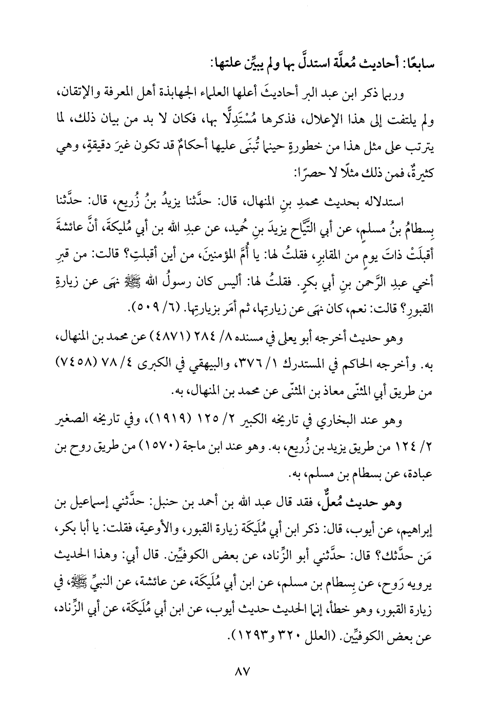 وهو حديث مُعلٌّ، فقد قال عبد اللَّه بن أحمد بن حنبل: حدَّثني إسماعيل بن إبراهيم، عن أيوب، قال: ذكر ابن أبي مُلَيكَة زيارة القبور، والأوعية، فقلت: يا أبا بكر، مَن حدَّثك؟ قال: حدَّثني أبو الزِّناد، عن بعض الكوفيِّين. قال أبي: وهذا الحديث يرويه رَوح، عن بِسطام بن مسلم، عن ابن أبي مُلَيكَة، عن عائشة، عن النبيِّ -صلى اللَّه عليه وسلم-، في زيارة القبور، وهو خطأ، إنما الحديث حديث أيوب، عن ابن أبي مُلَيكَة، عن أبي الزِّناد، عن بعض الكوفيِّين. (العلل ٣٢٠ و ١٢٩٣).