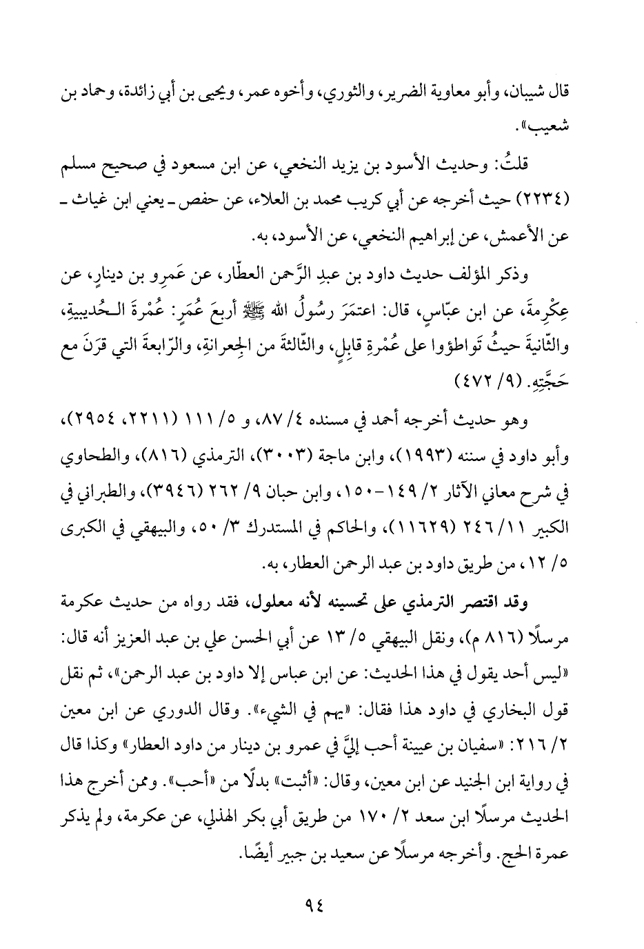 وقد اقتصر الترمذي على تحسينه لأنه معلول، فقد رواه من حديث عكرمة مرسلًا (٨١٦ م)، ونقل البيهقي ٥/ ١٣ عن أبي الحسن علي بن عبد العزيز أنه قال: "ليس أحد يقول في هذا الحديث: عن ابن عباس إلا داود بن عبد الرحمن"، ثم نقل قول البخاري في داود هذا فقال: "يهم في الشيء". وقال الدوري عن ابن معين ٢/ ٢١٦: "سفيان بن عيينة أحب إليَّ في عمرو بن دينار من داود العطار" وكذا قال في رواية ابن الجنيد عن ابن معين، وقال: "أثبت" بدلًا من "أحب". وممن أخرج هذا الحديث مرسلًا ابن سعد ٢/ ١٧٠ من طريق أبي بكر الهذلي، عن عكرمة، ولم يذكر عمرة الحج. وأخرجه مرسلًا عن سعيد بن جبير أيضًا.