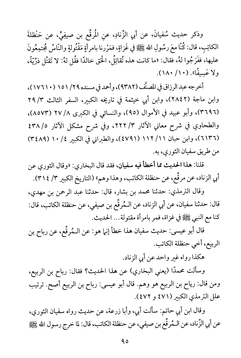 وذكر حديث سُفيانَ، عن أبي الزِّنادِ، عنِ المُرقِّع بن صيفِيٍّ، عن حَنْظلةَ الكاتِبِ، قال: كُنّا معَ رسُولِ اللَّه -صلى اللَّه عليه وسلم- في غَزاةٍ، فمَرْرنا بامرأةٍ مَقْتُولةٍ والنّاسُ مجُتمِعُونَ عليها، ففَرَجُوا لهُ، فقال: "ما كانت هذه تُقاتِلُ، الْحَق خالدًا فقُل لهُ: لا تَقتُل ذرِّيّةً، ولا عَسِيفًا". (١٠/ ١٨٠).