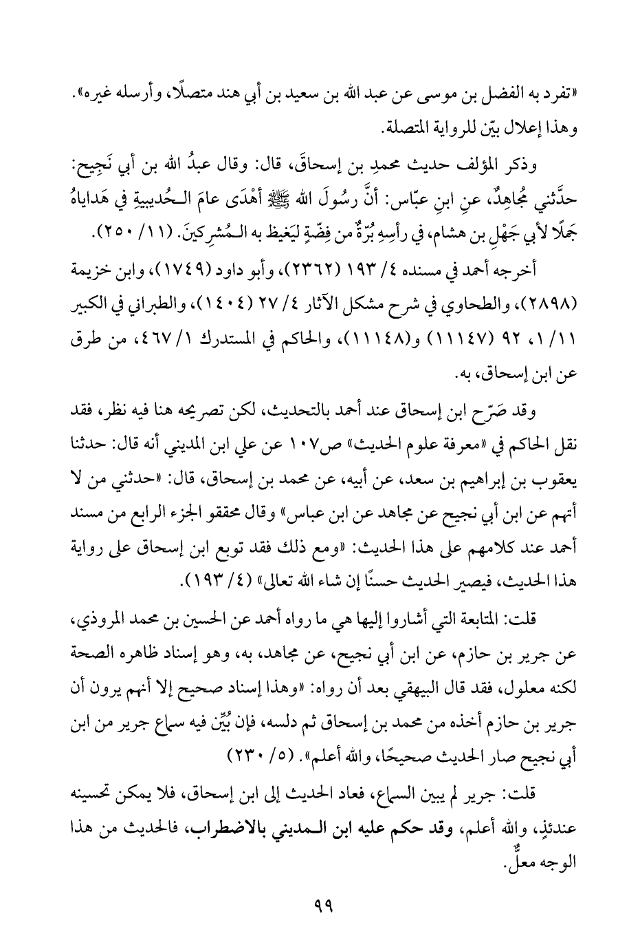 وقد صَرّح ابن إسحاق عند أحمد بالتحديث، لكن تصريحه هنا فيه نظر، فقد نقل الحاكم في "معرفة علوم الحديث" ص ١٠٧ عن علي ابن المديني أنه قال: حدثنا يعقوب بن إبراهيم بن سعد، عن أبيه، عن محمد بن إسحاق، قال: "حدثني من لا أتهم عن ابن أبي نجيح عن مجاهد عن ابن عباس" وقال محققو الجزء الرابع من مسند أحمد عند كلامهم على هذا الحديث: "ومع ذلك فقد توبع ابن إسحاق على رواية هذا الحديث، فيصير الحديث حسنًا إن شاء اللَّه تعالى" (٤/ ١٩٣).