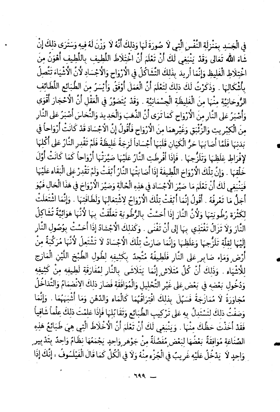 في الجسد بمنزلة النّفس الّتي لا صورة لها وذلك أنّه لا وزن له فيه وسترى ذلك إن شاء الله تعالى وقد ينبغي لك أن تعلم أنّ اختلاط اللّطيف باللّطيف أهون من اختلاط الغليظ وإنّما أريد بذلك التّشاكل في الأرواح والأجساد لأنّ الأشياء تتّصل بأشكالها. وذكرت لك ذلك لتعلم أنّ العمل أوفق وأيسر من الطّبائع اللّطائف الرّوحانيّة منها من الغليظة الجسمانيّة. وقد يتصوّر في العقل أنّ الأحجار أقوى وأصبر على النّار من الأرواح كما ترى أنّ الذّهب والحديد والنّحاس أصبر على النّار من الكبريت والزّئبق وغيرهما من الأرواح فأقول إنّ الأجساد قد كانت أرواحا في بدنها فلمّا أصابها حرّ الكيان قلبها أجسادا لزجة غليظة فلم تقدر النّار على أكلها لإفراط غلظها وتلزّجها. فإذا أفرطت النّار عليها صيّرتها أرواحا كما كانت أوّل خلقها. وإنّ تلك الأرواح اللّطيفة إذا أصابتها النّار أبقت ولم تقدر على البقاء عليها فينبغي لك أن تعلم ما صيّر الأجساد في هذه الحالة وصيّر الأرواح في هذا الحال فهو أجلّ ما تعرفه. أقول إنّما أبقت تلك الأرواح لاشتعالها ولطافتها. وإنّما اشتعلت لكثرة رطوبتها ولأنّ النّار إذا أحسّت بالرّطوبة تعلّقت بها لأنّها هوائيّة تشاكل النّار ولا تزال تغتذي بها إلى أن تفنى. وكذلك الأجساد إذا أحسّت بوصول النّار إليها لقلّة تلزّجها وغلظها وإنّما صارت تلك الأجساد لا تشتعل لأنّها مركّبة من أرض وماء صابر على النّار فلطيفه متّحد بكثيفه لطول الطّبخ اللّين المازج للأشياء. وذلك أنّ كلّ متلاش إنّما يتلاشى بالنّار لمفارقة لطيفه من كثيفه ودخول بعضه في بعض على غير التّحليل والموافقة فصار ذلك الانضمام والتّداخل مجاورة لا ممازجة فسهل بذلك افتراقهما كالماء والدّهن وما أشبههما. وإنّما وصفت ذلك لتستدلّ به على تركيب الطّبائع وتقابلها فإذا علمت ذلك علما شافيا فقد أخذت حظّك منها. وينبغي لك أن تعلم أنّ الأخلاط الّتي هي طبائع هذه الصّناعة موافقة بعضها لبعض مفصّلة من جوهر واحد يجمعها نظام واحد بتدبير واحد لا يدخل عليه غريب في الجزء منه ولا في الكلّ كما قال الفيلسوف: إنّك إذا