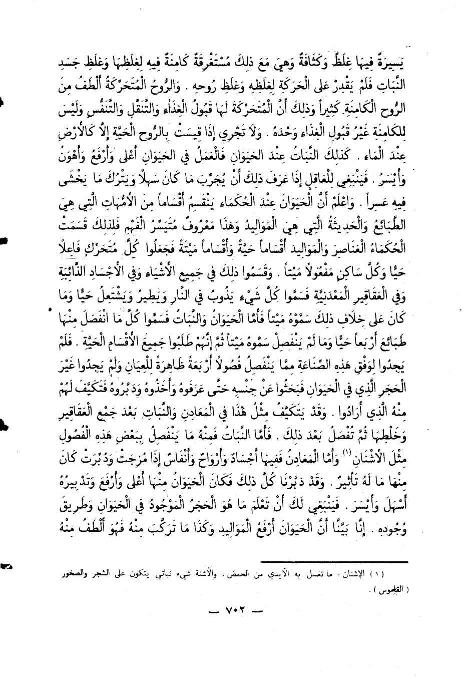يسيرة فيها غلظ وكثافة وهي مع ذلك مستغرقة كامنة فيه لغلظها وغلظ جسد النّبات فلم يقدر على الحركة لغلظه وغلظ روحه. والرّوح المتحرّكة ألطف من الرّوح الكامنة كثيرا وذلك أنّ المتحرّكة لها قبول الغذاء والتّنقّل والتّنفّس وليس للكامنة غير قبول الغذاء وحده. ولا تجري إذا قيست بالرّوح الحيّة إلّا كالأرض عند الماء. كذلك النّبات عند الحيوان فالعمل في الحيوان أعلى وأرفع وأهون وأيسر. فينبغي للعاقل إذا عرف ذلك أن يجرّب ما كان سهلا ويترك ما يخشى فيه عسرا. واعلم أنّ الحيوان عند الحكماء ينقسم أقساما من الأمّهات الّتي هي الطّبائع والحديثة الّتي هي المواليد وهذا معروف متيسّر الفهم فلذلك قسمت الحكماء العناصر والمواليد أقساما حيّة وأقساما ميتة فجعلوا كلّ متحرّك فاعلا حيّا وكلّ ساكن مفعولا ميتا. وقسموا ذلك في جميع الأشياء وفي الأجساد الذّائبة وفي العقاقير المعدنيّة فسمّوا كلّ شيء يذوب في النّار ويطير ويشتعل حيّا وما كان على خلاف ذلك سمّوه ميتا فأمّا الحيوان والنّبات فسمّوا كلّ ما انفصل منها طبائع أربعا حيّا وما لم ينفصل سمّوه ميتا ثمّ إنّهم طلبوا جميع الأقسام الحيّة. فلم يجدوا لوفق هذه الصّناعة ممّا ينفصل فصولا أربعة ظاهرة للعيان ولم يجدوا غير الحجر الّذي في الحيوان فبحثوا عن جنسه حتّى عرفوه وأخذوه ودبّروه فتكيّف لهم منه الّذي أرادوا. وقد يتكيّف مثل هذا في المعادن والنّبات بعد جمع العقاقير وخلطها ثمّ تفصل بعد ذلك. فأمّا النّبات فمنه ما ينفصل ببعض هذه الفصول مثل الأشنان [1] وأمّا المعادن ففيها أجساد وأرواح وأنفاس إذا مزجت ودبّرت كان منها ما له تأثير. وقد دبّرنا كلّ ذلك فكان الحيوان منها أعلى وأرفع وتدبيره أسهل وأيسر. فينبغي لك أن تعلم ما هو الحجر الموجود في الحيوان وطريق وجوده. إنّا بيّنّا أنّ الحيوان أرفع المواليد وكذا ما تركّب منه فهو ألطف منه