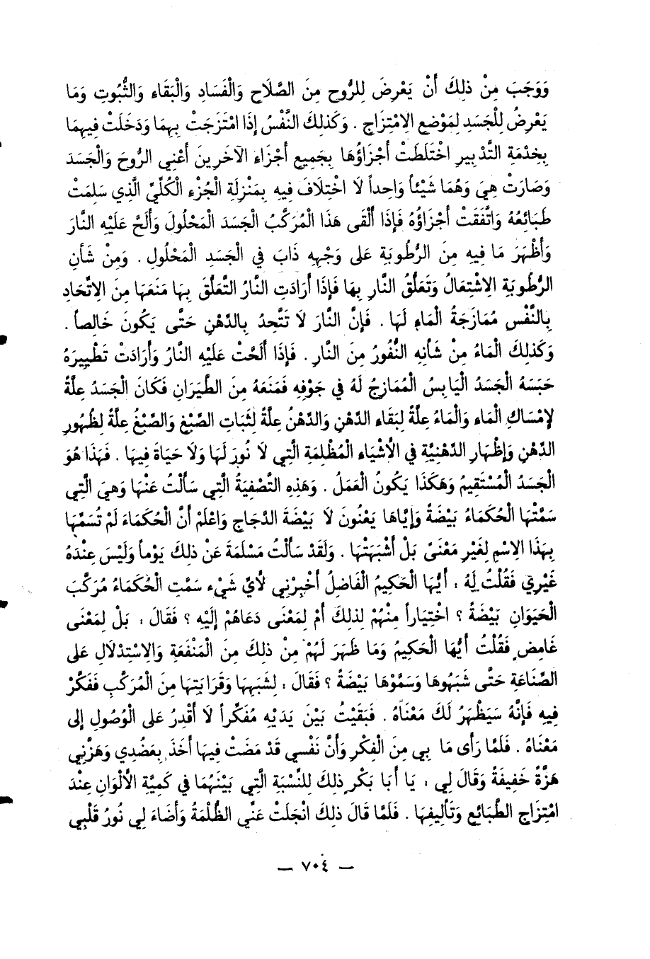 ووجب من ذلك أن يعرض للرّوح من الصّلاح والفساد والبقاء والثّبوت وما يعرض للجسد لموضع الامتزاج. وكذلك النّفس إذا امتزجت بهما ودخلت فيهما بخدمة التّدبير اختلطت أجزاؤها بجميع أجزاء الآخرين أعني الرّوح والجسد وصارت هي وهما شيئا واحدا لا اختلاف فيه بمنزلة الجزء الكلّيّ الّذي سلمت طبائعه واتّفقت أجزاؤه فإذا ألقى هذا المركّب الجسد المحلول وألحّ عليه النّار وأظهر ما فيه من الرّطوبة على وجهه ذاب في الجسد المحلول. ومن شأن الرّطوبة الاشتعال وتعلّق النّار بها فإذا أرادت النّار التّعلّق بها منعها من الاتّحاد بالنّفس ممازجة الماء لها. فإنّ النّار لا تتّحد بالدّهن حتّى يكون خالصا.