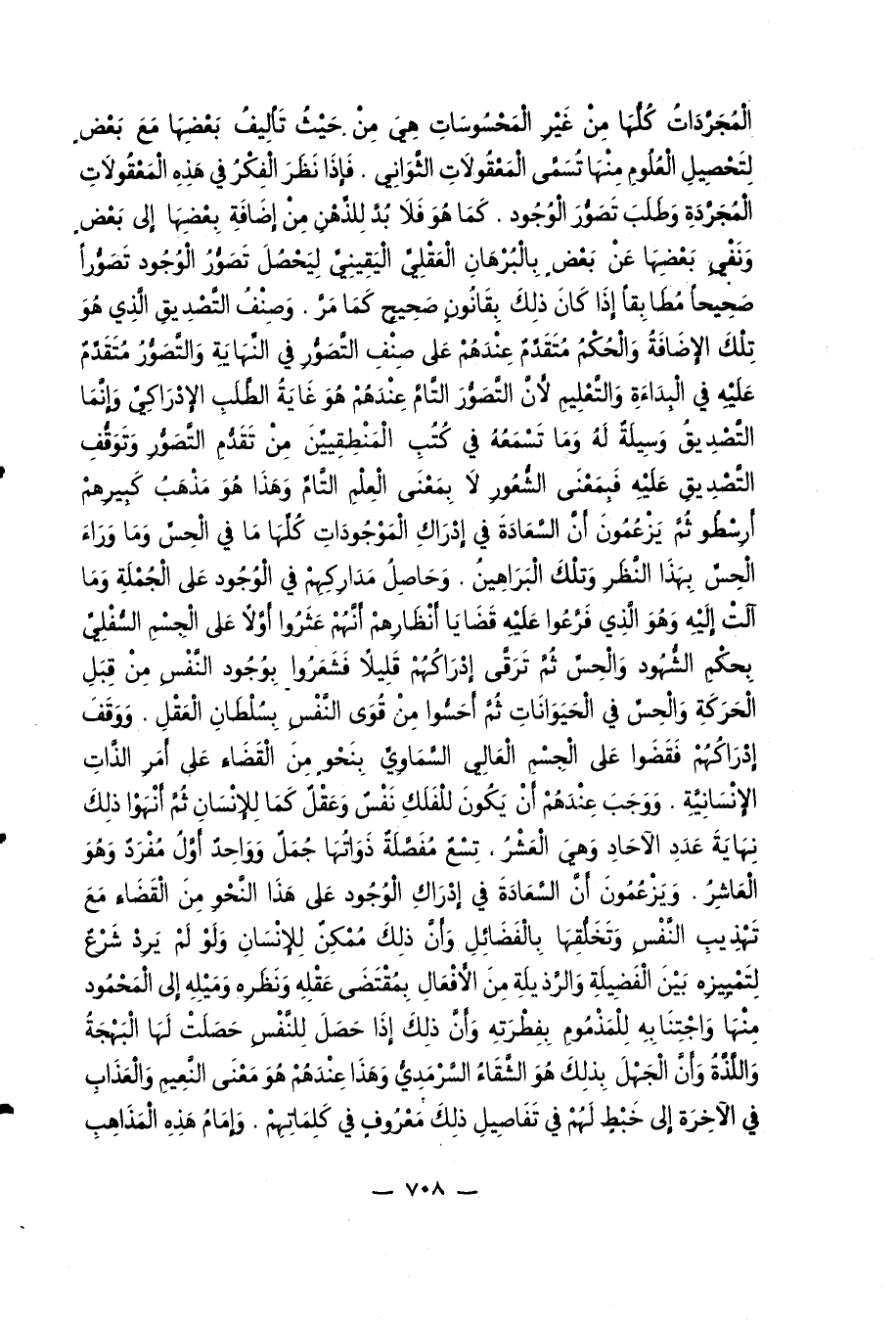 المجرّدات كلّها من غير المحسوسات هي من حيث تأليف بعضها مع بعض لتحصيل العلوم منها تسمّى المعقولات الثّواني. فإذا نظر الفكر في هذه المعقولات المجرّدة وطلب تصوّر الوجود. كما هو فلا بدّ للذّهن من إضافة بعضها إلى بعض ونفي بعضها عن بعض بالبرهان العقليّ اليقينيّ ليحصل تصوّر الوجود تصوّرا صحيحا مطابقا إذا كان ذلك بقانون صحيح كما مرّ. وصنف التّصديق الّذي هو تلك الاضافة والحكم متقدّم عندهم على صنف التّصوّر في النّهاية والتّصوّر متقدّم عليه في البداءة والتّعليم لأنّ التّصوّر التّامّ عندهم هو غاية الطّلب الإدراكيّ وإنّما التّصديق وسيلة له وما تسمعه في كتب المنطقيّين من تقدّم التّصوّر وتوقّف التّصديق عليه فبمعنى الشّعور لا بمعنى العلم التّامّ وهذا هو مذهب كبيرهم أرسطو ثمّ يزعمون أنّ السّعادة في إدراك الموجودات كلّها ما في الحسّ وما وراء الحسّ بهذا النّظر وتلك البراهين. وحاصل مداركهم في الوجود على الجملة وما آلت إليه وهو الّذي فرّعوا عليه قضايا أنظارهم أنّهم عثروا أوّلا على الجسم السّفليّ بحكم الشّهود والحسّ ثمّ ترقّى إدراكهم قليلا فشعروا بوجود النّفس من قبل الحركة والحسّ في الحيوانات ثمّ أحسّوا من قوى النّفس بسلطان العقل. ووقف إدراكهم فقضوا على الجسم العالي السّماويّ بنحو من القضاء على أمر الذّات الإنسانيّة. ووجب عندهم أن يكون للفلك نفس وعقل كما للإنسان ثمّ أنهوا ذلك نهاية عدد الآحاد وهي العشر، تسع مفصّلة ذواتها جمل وواحد أوّل مفرد وهو العاشر. ويزعمون أنّ السّعادة في إدراك الوجود على هذا النّحو من القضاء مع تهذيب النّفس وتخلّقها بالفضائل وأنّ ذلك ممكن للإنسان ولو لم يرد شرع لتمييزه بين الفضيلة والرّذيلة من الأفعال بمقتضى عقله ونظره وميله إلى المحمود منها واجتنابه للمذموم بفطرته وأنّ ذلك إذا حصل للنّفس حصلت لها البهجة واللّذّة وأنّ الجهل بذلك هو الشّقاء السّرمديّ وهذا عندهم هو معنى النّعيم والعذاب في الآخرة إلى خبط لهم في تفاصيل ذلك معروف في كلماتهم. وإمام هذه المذاهب