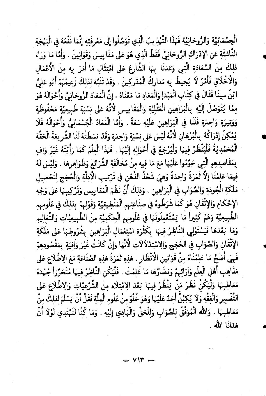 الجسمانيّة والرّوحانيّة فهذا التّهذيب الّذي توصّلوا إلى معرفته إنّما نفعه في البهجة النّاشئة عن الإدراك الرّوحانيّ فقط الّذي هو على مقاييس وقوانين. وأمّا ما وراء ذلك من السّعادة الّتي وعدنا بها الشّارع على امتثال ما أمر به من الأعمال والأخلاق فأمر لا يحيط به مدارك المدركين. وقد تنبّه لذلك زعيمهم أبو عليّ ابن سينا فقال في كتاب المبدإ والمعاد ما معناه: إنّ المعاد الرّوحانيّ وأحواله هو ممّا يتوصّل إليه بالبراهين العقليّة والمقاييس لأنّه على نسبة طبيعيّة محفوظة ووتيرة واحدة فلنا في البراهين عليه سعة. وأمّا المعاد الجسمانيّ وأحواله فلا يمكن إدراكه بالبرهان لأنّه ليس على نسبة واحدة وقد بسطته لنا الشّريعة الحقّة المحمّديّة فلينظر فيها وليرجع في أحواله إليها. فهذا العلم كما رأيته غير واف بمقاصدهم الّتي حوّموا عليها مع ما فيه من مخالفة الشّرائع وظواهرها. وليس له فيما علمنا إلّا ثمرة واحدة وهي شحذ الذّهن في ترتيب الأدلّة والحجج لتحصيل ملكة الجودة والصّواب في البراهين. وذلك أنّ نظم المقاييس وتركيبها على وجه الإحكام والإتقان هو كما شرطوه في صناعتهم المنطيقيّة وقولهم بذلك في علومهم الطّبيعيّة وهم كثيرا ما يستعملونها في علومهم الحكميّة من الطّبيعيّات والتّعاليم وما بعدها فيستولي النّاظر فيها بكثرة استعمال البراهين بشروطها على ملكة الإتقان والصّواب في الحجج والاستدلالات لأنّها وإن كانت غير وافية بمقصودهم فهي أصحّ ما علمناه من قوانين الأنظار. هذه ثمرة هذه الصّناعة مع الاطّلاع على مذاهب أهل العلم وآرائهم ومضارّها ما علمت. فليكن النّاظر فيها متحرّزا جهده معاطبها وليكن نظر من ينظر فيها بعد الامتلاء من الشّرعيّات والاطّلاع على التّفسير والفقه ولا يكبّنّ أحد عليها وهو خلو من علوم الملّة فقلّ أن يسلم لذلك من معاطبها. والله الموفّق للصّواب وللحقّ والهادي إليه. وَما كُنَّا لِنَهْتَدِيَ لَوْلا أَنْ هَدانَا الله 7: 43