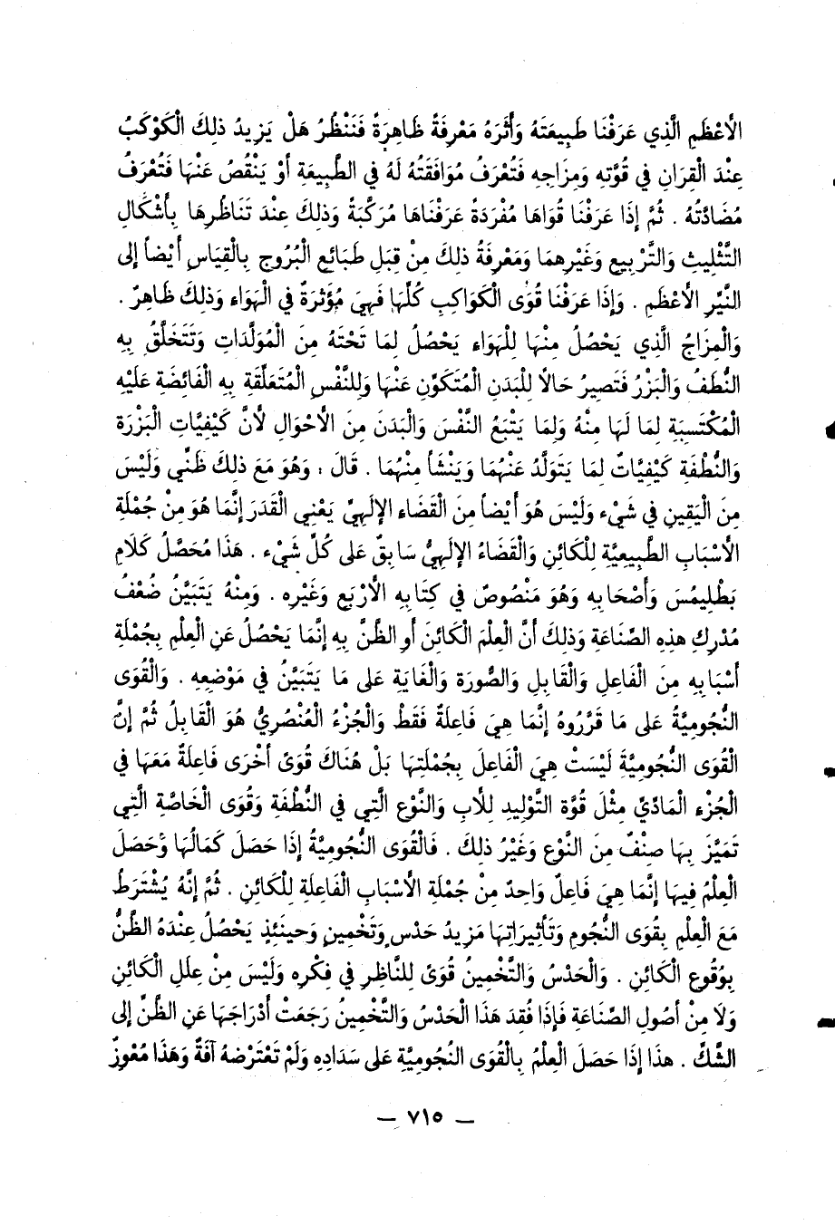 والمزاج الّذي يحصل منها للهواء يحصل لما تحته من المولّدات وتتخلّق به النّطف والبزر فتصير حالا للبدن المتكوّن عنها وللنّفس المتعلّقة به الفائضة عليه المكتسبة لما لها منه ولما يتبع النّفس والبدن من الأحوال لأنّ كيفيّات البزرة والنّطفة كيفيّات لما يتولّد عنهما وينشأ منهما. قال: وهو مع ذلك ظنّي وليس من اليقين في شيء وليس هو أيضا من القضاء الإلهيّ يعني القدر إنّما هو من جملة الأسباب الطّبيعيّة للكائن والقضاء الإلهيّ سابق على كلّ شيء. هذا محصّل كلام بطليمس وأصحابه وهو منصوص في كتابه الأربع وغيره. ومنه يتبيّن ضعف مدرك هذه الصّناعة وذلك أنّ العلم الكائن أو الظّنّ به إنّما يحصل عن العلم بجملة أسبابه من الفاعل والقابل والصّورة والغاية على ما يتبيّن في موضعه. والقوى النّجوميّة على ما قرّروه إنّما هي فاعلة فقط والجزء العنصريّ هو القابل ثمّ إنّ القوى النّجوميّة ليست هي الفاعل بجملتها بل هناك قوى أخرى فاعلة معها في الجزء المادّيّ مثل قوّة التّوليد للأب والنّوع الّتي في النّطفة وقوى الخاصّة الّتي تميّز بها صنف من النّوع وغير ذلك. فالقوى النّجوميّة إذا حصل كمالها وحصل العلم فيها إنّما هي فاعل واحد من جملة الأسباب الفاعلة للكائن. ثمّ إنّه يشترط مع العلم بقوى النّجوم وتأثيراتها مزيد حدس وتخمين وحينئذ يحصل عنده الظّنّ بوقوع الكائن. والحدس والتّخمين قوى للنّاظر في فكره وليس من علل الكائن ولا من أصول الصّناعة فإذا فقد هذا الحدس والتّخمين رجعت أدراجها عن الظّنّ إلى الشّكّ. هذا إذا حصل العلم بالقوى النجوميّة على سداده ولم تعترضه آفة وهذا معوز