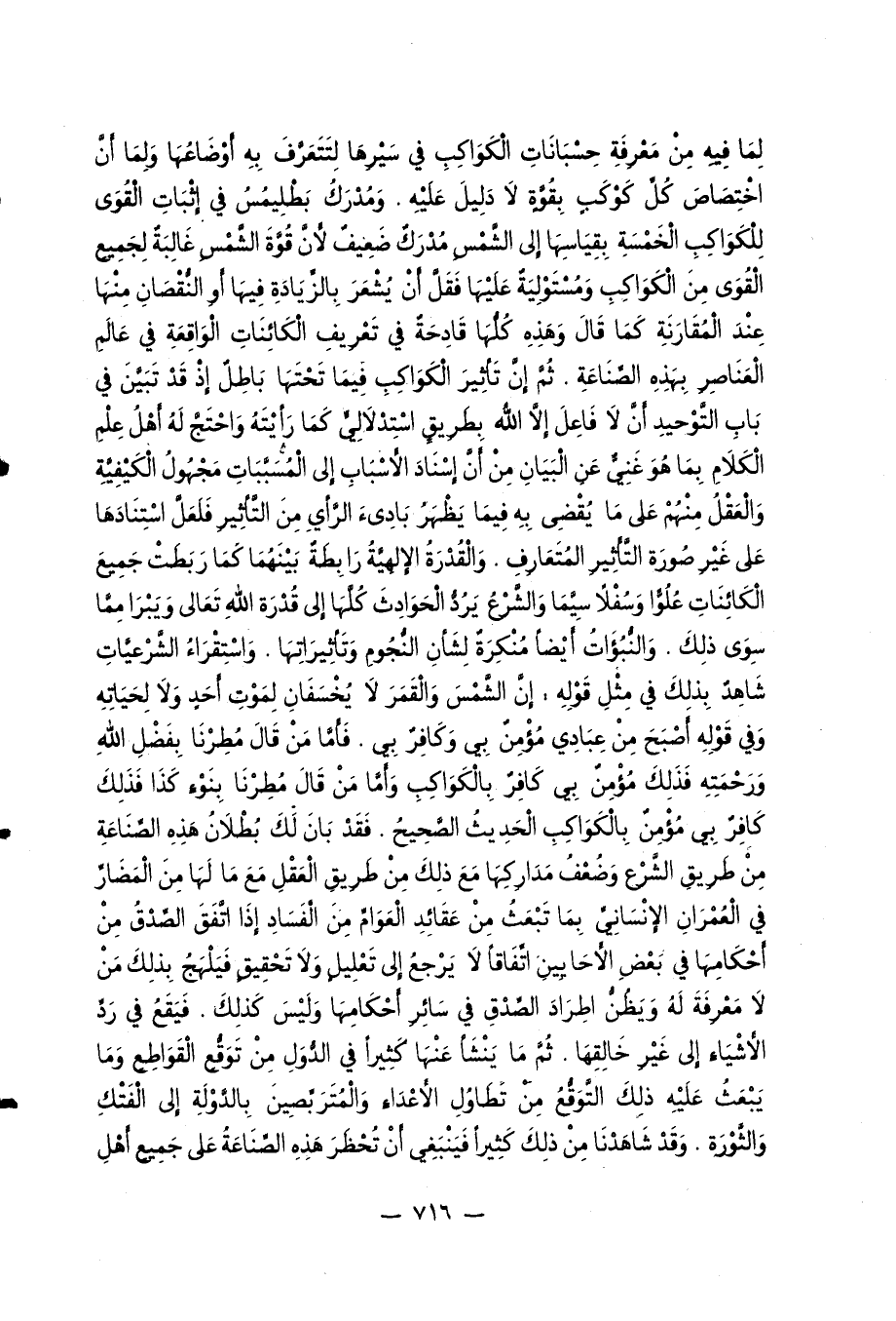 لما فيه من معرفة حسبانات الكواكب في سيرها لتتعرّف به أوضاعها ولما أنّ اختصاص كلّ كوكب بقوّة لا دليل عليه. ومدرك بطليمس في إثبات القوى للكواكب الخمسة بقياسها إلى الشّمس مدرك ضعيف لأنّ قوّة الشّمس غالبة لجميع القوى من الكواكب ومستولية عليها فقلّ أن يشعر بالزّيادة فيها أو النّقصان منها عند المقارنة كما قال وهذه كلّها قادحة في تعريف الكائنات الواقعة في عالم العناصر بهذه الصّناعة. ثمّ إنّ تأثير الكواكب فيما تحتها باطل إذ قد تبيّن في باب التّوحيد أنّ لا فاعل إلّا الله بطريق استدلاليّ كما رأيته واحتجّ له أهل علم الكلام بما هو غنيّ عن البيان من أنّ إسناد الأسباب إلى المسبّبات مجهول الكيفيّة والعقل منهم على ما يقضى به فيما يظهر بادئ الرّأي من التّأثير فلعلّ استنادها على غير صورة التّأثير المتعارف. والقدرة الإلهيّة رابطة بينهما كما ربطت جميع الكائنات علوّا وسفلا سيّما والشّرع يردّ الحوادث كلّها إلى قدرة الله تعالى ويبرأ ممّا سوى ذلك. والنّبوءات أيضا منكرة لشأن النّجوم وتأثيراتها. واستقراء الشّرعيّات شاهد بذلك في مثل قوله: إنّ الشّمس والقمر لا يخسفان لموت أحد ولا لحياته وفي قوله أصبح من عبادي مؤمن بي وكافر بي. فأمّا من قال مطرنا بفضل الله ورحمته فذلك مؤمن بي كافر بالكواكب وأمّا من قال مطرنا بنوء كذا فذلك كافر بي مؤمن بالكواكب الحديث الصّحيح. فقد بان لك بطلان هذه الصّناعة من طريق الشّرع وضعف مداركها مع ذلك من طريق العقل مع ما لها من المضارّ في العمران الإنسانيّ بما تبعث من عقائد العوامّ من الفساد إذا اتّفق الصّدق من أحكامها في بعض الأحايين اتّفاقا لا يرجع إلى تعليل ولا تحقيق فيلهج بذلك من لا معرفة له ويظنّ اطراد الصّدق في سائر أحكامها وليس كذلك. فيقع في ردّ الأشياء إلى غير خالقها. ثمّ ما ينشأ عنها كثيرا في الدّول من توقّع القواطع وما يبعث عليه ذلك التّوقّع من تطاول الأعداء والمتربّصين بالدّولة إلى الفتك والثّورة. وقد شاهدنا من ذلك كثيرا فينبغي أن تحظر هذه الصّناعة على جميع أهل