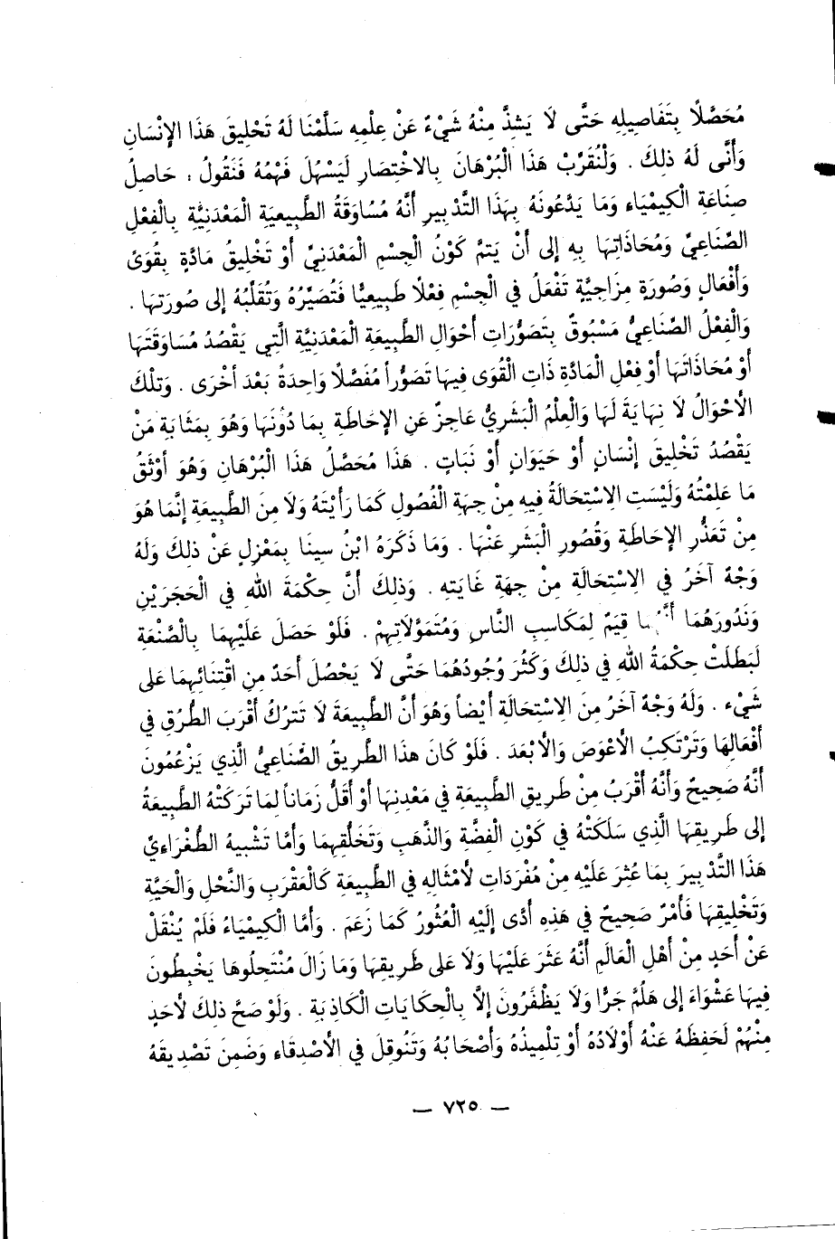 والفعل الصّناعيّ مسبوق بتصوّرات أحوال الطّبيعة المعدنيّة الّتي يقصد مساوقتها أو محاذاتها أو فعل المادّة ذات القوى فيها تصوّرا مفصّلا واحدة بعد أخرى. وتلك الأحوال لا نهاية لها والعلم البشريّ عاجز عن الإحاطة بما دونها وهو بمثابة من يقصد تخليق إنسان أو حيوان أو نبات. هذا محصّل هذا البرهان وهو أوثق ما علمته وليست الاستحالة فيه من جهة الفصول كما رأيته ولا من الطّبيعة إنّما هو من تعذّر الإحاطة وقصور البشر عنها. وما ذكره ابن سينا بمعزل عن ذلك وله وجه آخر في الاستحالة من جهة غايته. وذلك أنّ حكمة الله في الحجرين وندورهما أنّهما قيم لمكاسب النّاس ومتموّلاتهم. فلو حصل عليهما بالصّنعة لبطلت حكمة الله في ذلك وكثر وجودهما حتّى لا يحصل أحد من اقتنائهما على شيء. وله وجه آخر من الاستحالة أيضا وهو أنّ الطّبيعة لا تترك أقرب الطّرق في أفعالها وترتكب الأعوص والأبعد. فلو كان هذا الطّريق الصّناعيّ الّذي يزعمون أنّه صحيح وأنّه أقرب من طريق الطّبيعة في معدنها أو أقلّ زمانا لما تركته الطّبيعة إلى طريقها الّذي سلكته في كون الفضّة والذّهب وتخلّقهما وأمّا تشبيه الطّغراءي هذا التّدبير بما عثر عليه من مفردات لأمثاله في الطّبيعة كالعقرب والنّحل والحيّة وتخليقها فأمر صحيح في هذه أدّى إليه العثور كما زعم. وأمّا الكيمياء فلم ينقل عن أحد من أهل العالم أنّه عثر عليها ولا على طريقها وما زال منتحلوها يخبطون فيها عشواء إلى هلمّ جرّا ولا يظفرون إلّا بالحكايات الكاذبة. ولو صحّ ذلك لأحد منهم لحفظه عنه أولاده أو تلميذه وأصحابه وتنوقل في الأصدقاء وضمن تصديقه