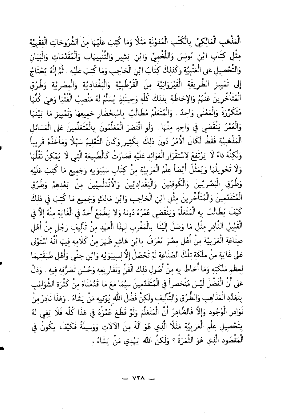 المذهب المالكيّ بالكتب المدوّنة مثلا وما كتب عليها من الشّروحات الفقهيّة مثل كتاب ابن يونس واللّخميّ وابن بشير والتّنبيهات والمقدّمات والبيان والتّحصيل على العتبيّة وكذلك كتاب ابن الحاجب وما كتب عليه. ثمّ إنّه يحتاج إلى تمييز الطّريقة القيروانيّة من القرطبيّة والبغداديّة والمصريّة وطرق المتأخّرين عنهم والإحاطة بذلك كلّه وحينئذ يسلّم له منصب الفتيا وهي كلّها متكرّرة والمعنى واحد. والمتعلّم مطالب باستحضار جميعها وتمييز ما بينها والعمر ينقضي في واحد منها. ولو اقتصر المعلّمون بالمتعلّمين على المسائل المذهبيّة فقط لكان الأمر دون ذلك بكثير وكان التّعليم سهلا ومأخذه قريبا ولكنّه داء لا يرتفع لاستقرار العوائد عليه فصارت كالطبيعة الّتي لا يمكن نقلها ولا تحويلها ويمثّل أيضا علم العربيّة من كتاب سيبويه وجميع ما كتب عليه وطرق البصريّين والكوفيّين والبغداديّين والأندلسيّين من بعدهم وطرق المتقدّمين والمتأخّرين مثل ابن الحاجب وابن مالك وجميع ما كتب في ذلك كيف يطالب به المتعلّم وينقضي عمره دونه ولا يطمع أحد في الغاية منه إلّا في القليل النّادر مثل ما وصل إلينا بالمغرب لهذا العهد من تآليف رجل من أهل صناعة العربيّة من أهل مصر يعرف بابن هاشم ظهر من كلامه فيها أنّه استولى على غاية من ملكة تلك الصّناعة لم تحصل إلّا لسيبويه وابن جنّي وأهل طبقتهما لعظم ملكته وما أحاط به من أصول ذلك الفنّ وتفاريعه وحسن تصرّفه فيه. ودلّ على أنّ الفضل ليس منحصرا في المتقدّمين سيّما مع ما قدّمناه من كثرة الشّواغب بتعدّد المذاهب والطّرق والتّآليف ولكنّ فضل الله يؤتيه من يشاء. وهذا نادر من نوادر الوجود وإلّا فالظّاهر أنّ المتعلّم ولو قطع عمره في هذا كلّه فلا يفي له بتحصيل علم العربيّة مثلا الّذي هو آلة من الآلات ووسيلة فكيف يكون في المقصود الّذي هو الثّمرة؟ ولكنّ الله يهدي من يشاء