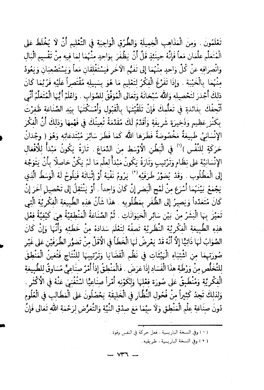 تعلمون. ومن المذاهب الجميلة والطّرق الواجبة في التّعليم أن لا يخلط على المتعلّم علمان معا فإنّه حينئذ قلّ أن يظفر بواحد منهما لما فيه من تقسيم البال وانصرافه عن كلّ واحد منهما إلى تفهّم الآخر فيستغلقان معا ويستصعبان ويعود منهما بالخيبة. وإذا تفرّغ الفكر لتعليم ما هو بسبيله مقتصرا عليه فربّما كان ذلك أجدر لتحصيله والله سبحانه وتعالى الموفّق للصّواب. واعلم أيّها المتعلّم أنّي أتحفك بفائدة في تعلّمك فإن تلقّيتها بالقبول وأمسكتها بيد الصّناعة ظفرت بكنز عظيم وذخيرة شريفة وأقدّم لك مقدّمة تعينك في فهمها وذلك أنّ الفكر الإنسانيّ طبيعة مخصوصة فطرها الله كما فطر سائر مبتدعاته وهو (وجدان حركة للنّفس) [1] في البطن الأوسط من الدّماغ. تارة يكون مبدأ للأفعال الإنسانيّة على نظام وترتيب وتارة يكون مبدأ لعلم ما لم يكن حاصلا بأن يتوجّه إلى المطلوب. وقد يصوّر طرفيه [2] يروم نفيه أو إثباته فيلوح له الوسط الّذي يجمع بينهما أسرع من لمح البصر إن كان واحدا. أو ينتقل إلى تحصيل آخر إن كان متعدّدا ويصير إلى الظّفر بمطلوبه هذا شأن هذه الطّبيعة الفكريّة الّتي تميّز بها البشر من بين سائر الحيوانات. ثمّ الصّناعة المنطقيّة هي كيفيّة فعل هذه الطّبيعة الفكريّة النّظريّة تصفه لتعلم سداده من خطئه وأنّها وإن كان الصّواب لها ذاتيّا إلّا أنّه قد يعرض لها الخطأ في الأقلّ من تصوّر الطّرفين على غير صورتهما من اشتباه الهيئات في نظم القضايا وترتيبها للنّتاج فتعين المنطق للتّخلّص من ورطة هذا الفساد إذا عرض. فالمنطق إذا أمر صناعيّ مساوق للطّبيعة الفكريّة ومنطبق على صورة فعلها ولكونه أمرا صناعيّا استغني عنه في الأكثر.