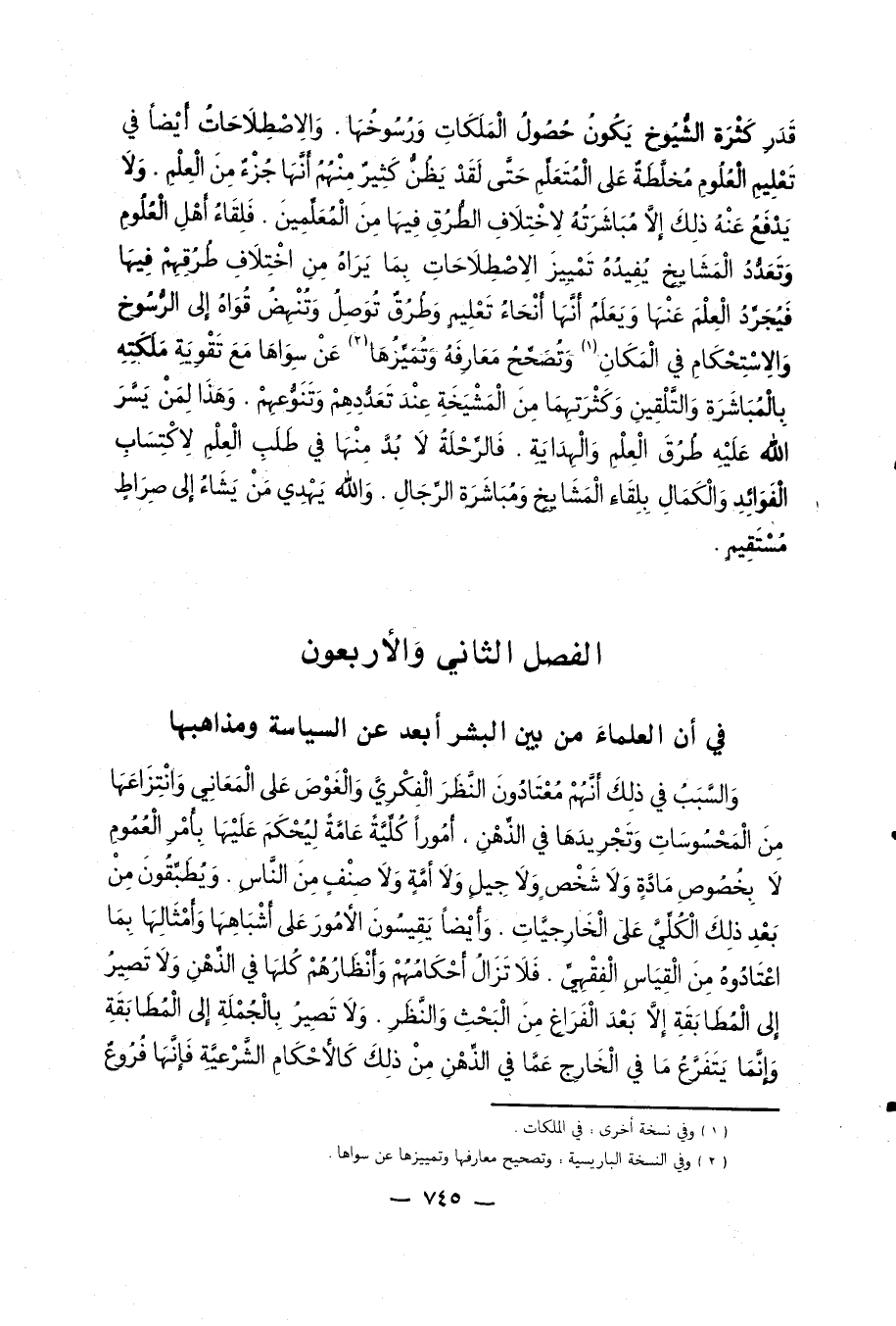 قدر كثرة الشّيوخ يكون حصول الملكات ورسوخها. والاصطلاحات أيضا في تعليم العلوم مخلّطة على المتعلّم حتّى لقد يظنّ كثير منهم أنّها جزء من العلم. ولا يدفع عنه ذلك إلّا مباشرته لاختلاف الطّرق فيها من المعلّمين. فلقاء أهل العلوم وتعدّد المشايخ يفيده تمييز الاصطلاحات بما يراه من اختلاف طرقهم فيها فيجرّد العلم عنها ويعلم أنّها أنحاء تعليم وطرق توصل وتنهض قواه إلى الرّسوخ والاستحكام في المكان [1] وتصحّح معارفه وتميّزها [2] عن سواها مع تقوية ملكته بالمباشرة والتّلقين وكثرتهما من المشيخة عند تعدّدهم وتنوّعهم. وهذا لمن يسّر الله عليه طرق العلم والهداية. فالرّحلة لا بدّ منها في طلب العلم لاكتساب الفوائد والكمال بلقاء المشايخ ومباشرة الرّجال. وَالله يَهْدِي من يَشاءُ إِلى صِراطٍ مُسْتَقِيمٍ 2: 213.