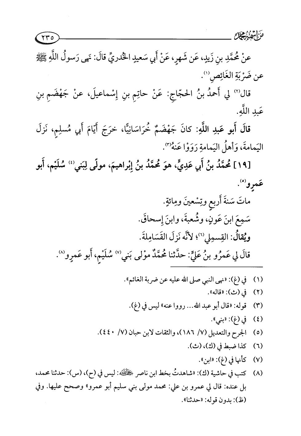 (¬٨) كتب في حاشية (ك): "شاهدتُ بخط ابن ناصر -رحمه اللَّه-: ليس في (ح)، (س): حدثنا محمد، بل عنده: قال لي عمرو بن علي: محمد مولى بني سليم أبو عمرو" وصحح عليها. وفي (ظ): بدون قوله: "حدثنا".