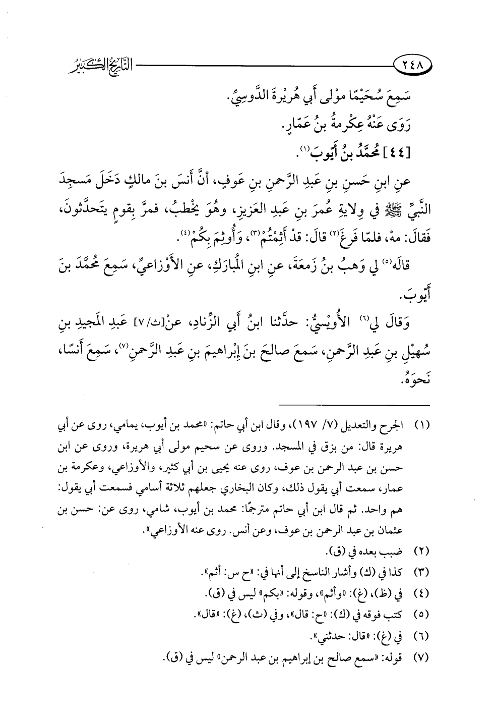 (¬١) الجرح والتعديل (٧/ ١٩٧)، وقال ابن أبي حاتم: "محمد بن أَيوب، يمامي، روى عن أبي هريرة قال: من بزق في المسجد. وروى عن سحيم مولى أبي هريرة، وروى عن ابن حسن بن عبد الرحمن بن عوف، روى عنه يحيى بن أبي كثير، والأوزاعي، وعكرمة بن عمار، سمعت أبي يقول ذلك، وكان البخاري جعلهم ثلاثة أسامي فسمعت أبي يقول: هم واحد. ثم قال ابن أبي حاتم مترجمًا: محمد بن أيوب، شامي، روى عن: حسن بن عثمان بن عبد الرحمن بن عوف، وعن أنس. روى عنه الأوزاعي".