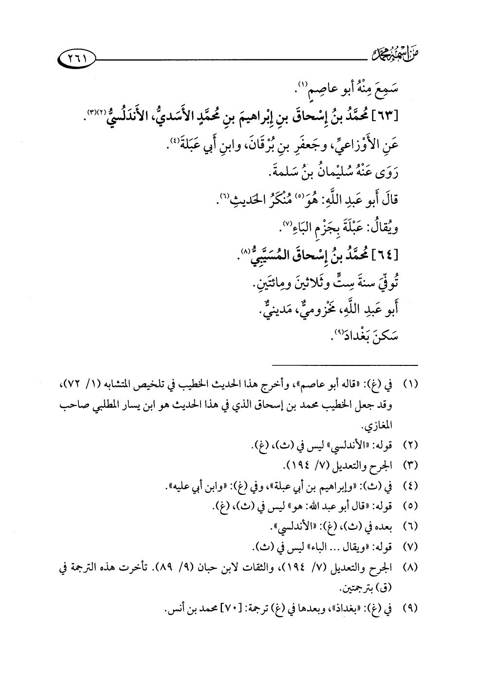 (¬٩) في (غ): "بغداذ"، وبعدها في (غ) ترجمة: [٧٠] محمد بن أنس.