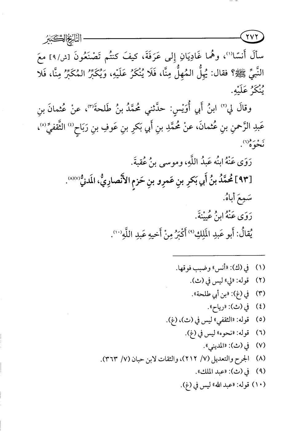 وقالَ لي (¬٢) ابنُ أَبي أُوَيْسٍ: حدَّثني مُحمَّدُ بنُ طَلحةَ (¬٣)، عنْ عُثمانَ بنِ عَبدِ الرَّحمنِ بنِ عُثمانَ، عنْ مُحمَّدِ بنِ أَبي بَكرِ بنِ عَوفِ بنِ رَبَاحٍ (¬٤) الثَّقفيِّ (¬٥)، نَحْوَهُ (¬٦).