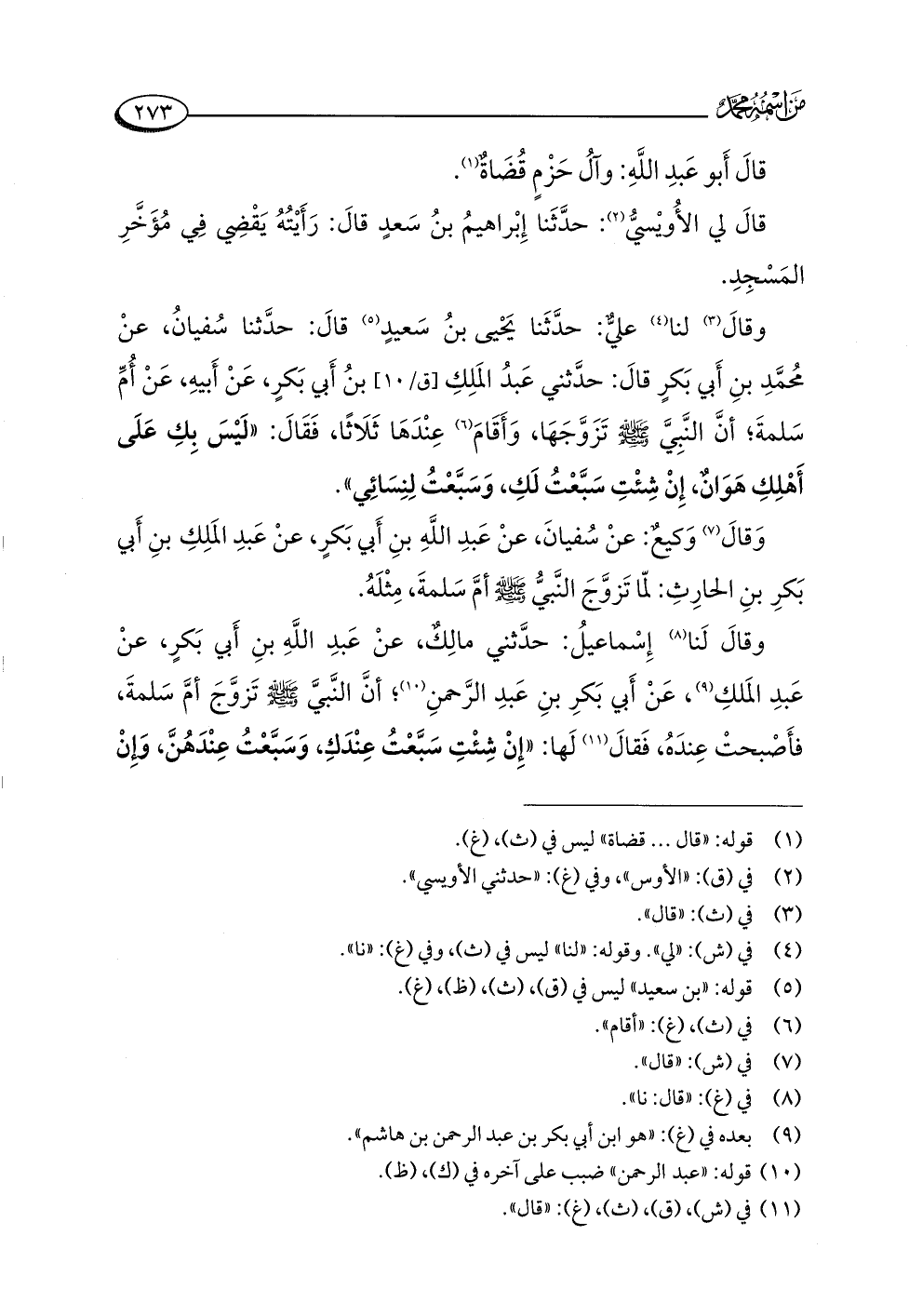 وقالَ (¬٣) لنا (¬٤) عليٌّ: حدَّثَنا يَحْيى بنُ سَعيدٍ (¬٥) قالَ: حدَّثنا سُفيانُ، عنْ مُحمَّدِ بنِ أَبي بَكرٍ قالَ: حدَّثني عَبدُ المَلِكِ بنُ أَبي بَكرٍ، عَنْ أَبيهِ، عَنْ أُمِّ سَلمةَ؛ أنَّ النَّبِيَّ -صلى اللَّه عليه وسلم- تَزَوَّجَهَا، وَأَقَامَ (¬٦) عِنْدَهَا ثَلَاثًا، فَقَالَ: "لَيْسَ بِكِ عَلَى أَهْلِكِ هَوَانٌ، إِنْ شِئْتِ سَبَّعْتُ لَكِ، وَسَبَّعْتُ لِنِسَائِي".
