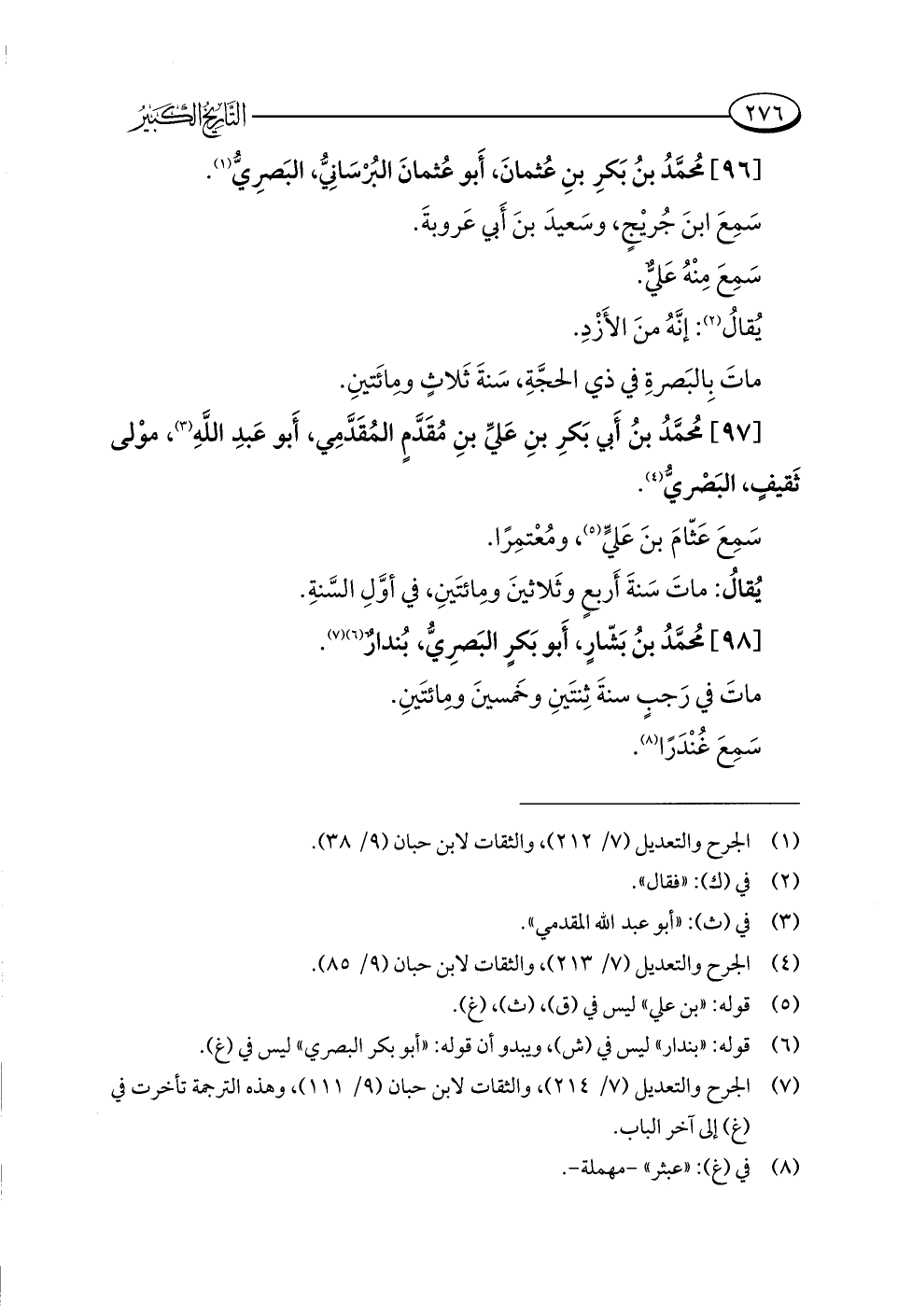 [٩٧] مُحمَّدُ بنُ أَبى بَكرِ بنِ عَليِّ بنِ مُقَدَّمٍ المُقَدَّمِي، أَبو عَبدِ اللَّهِ (¬٣)، موْلى ثَقيفٍ، البَصْريُّ (¬٤).