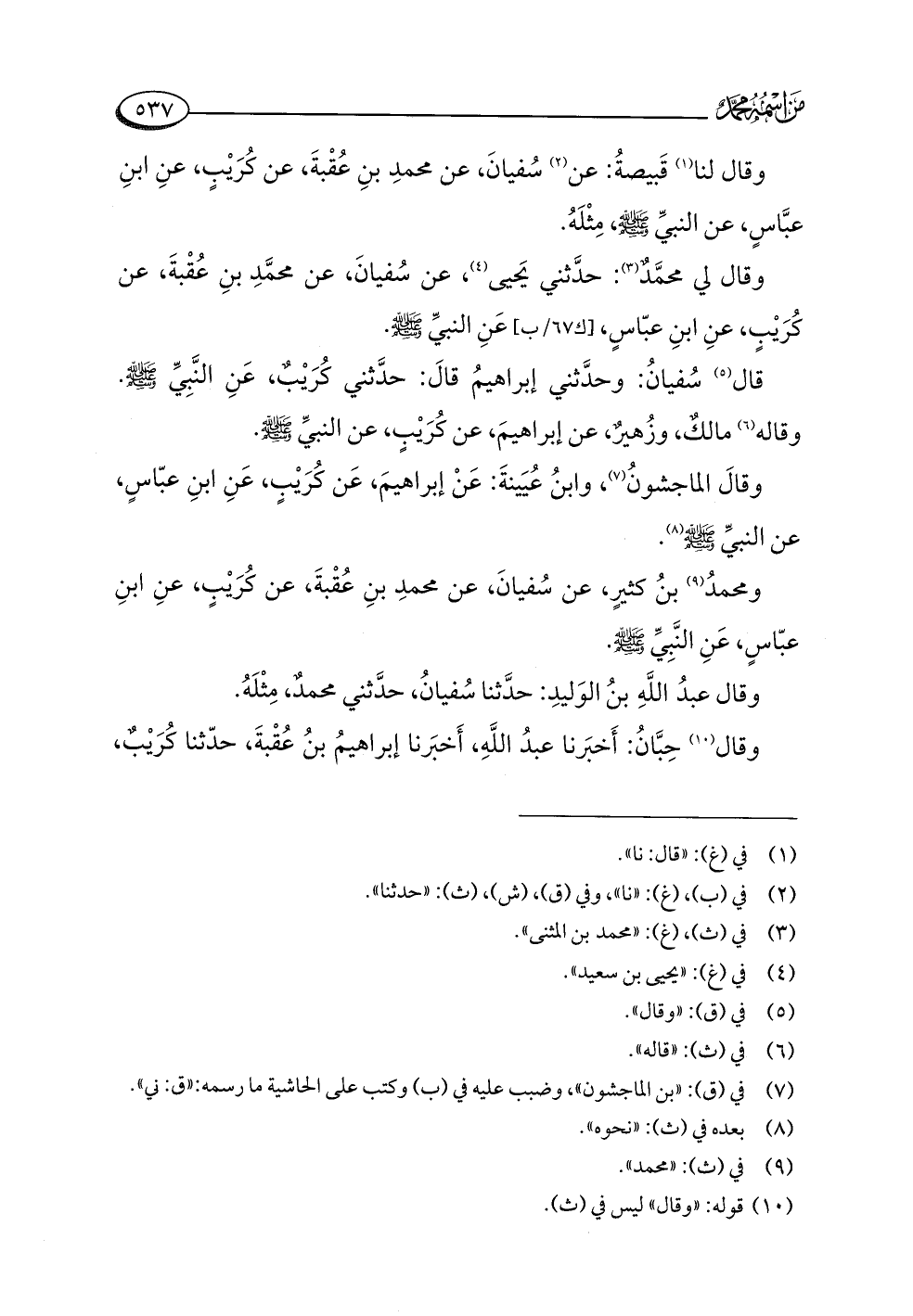 ومحمدُ (¬٩) بنُ كثيرٍ، عن سُفيانَ، عن محمدِ بنِ عُقْبةَ، عن كُرَيْبٍ، عنِ ابنِ عبّاسٍ، عَنِ النَّبِيِّ -صلى اللَّه عليه وسلم-.