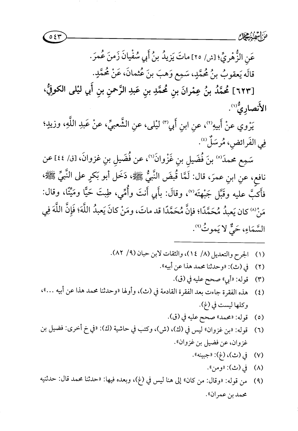 سَمِع محمدَ (¬٥) بنَ فُضَيلِ بنِ غَزْوانَ (¬٦)، عن فُضَيلِ بنِ غزوانَ، عن نافعٍ، عنِ ابنِ عمرَ، قال: لَمَّا قُبضَ النَّبيُّ -صلى اللَّه عليه وسلم-، دَخَل أبو بَكرٍ على النَّبيِّ -صلى اللَّه عليه وسلم-، فأَكبَّ عليه وقَبَّل جَبْهتَه (¬٧)، وقالَ: بأَبي أَنتَ وأُمِّي، طِبتَ حَيًّا ومَيِّتًا، وقال: مَنْ (¬٨) كان يَعبدُ مُحَمَّدًا، فإنَّ مُحَمَّدًا قد ماتَ، ومَنْ كانَ يَعبدُ اللَّهَ، فَإِنَّ اللَّهَ في السَّمَاءِ، حَيٌّ لا يَموتُ (¬٩).