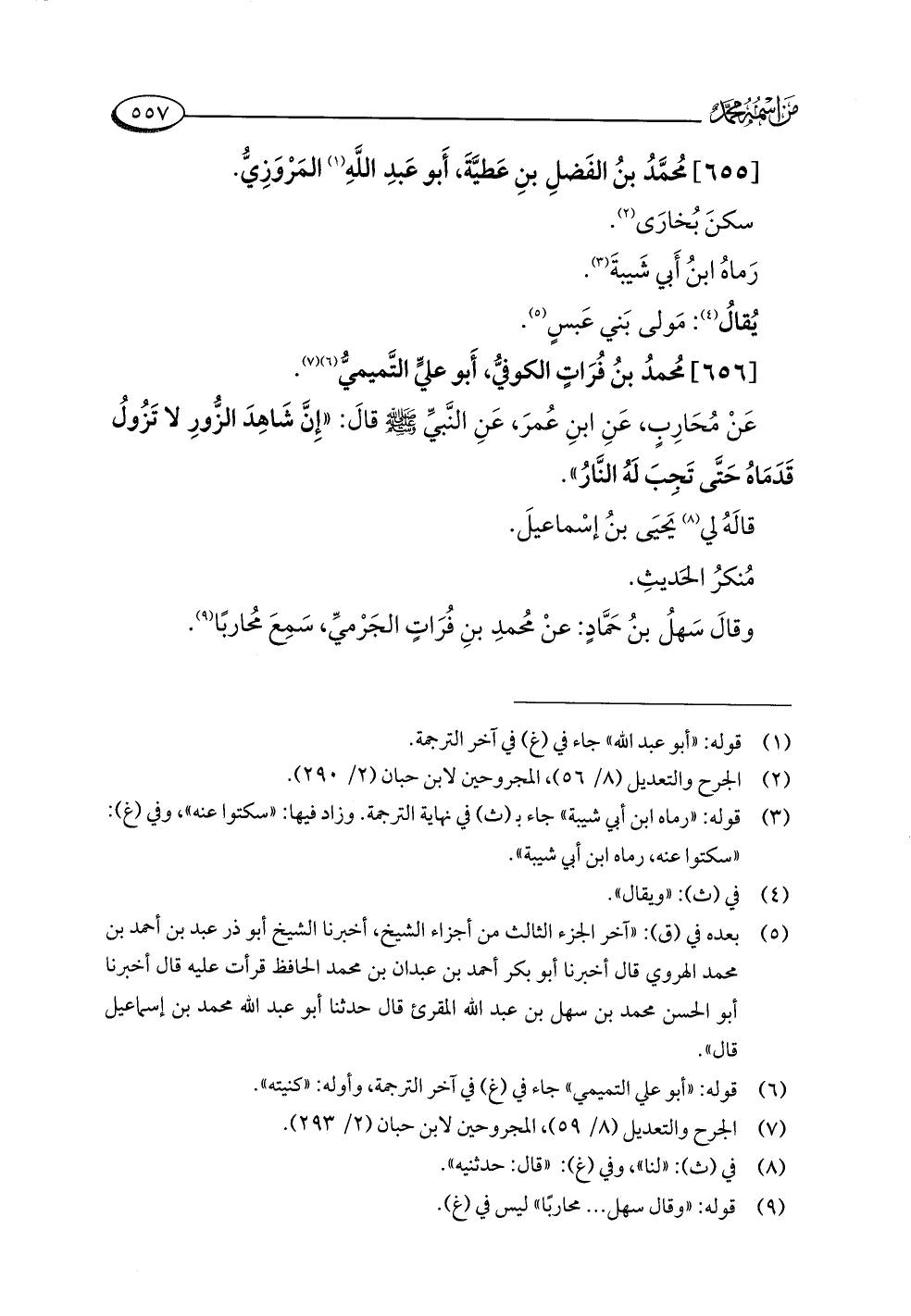 وقالَ سَهلُ بنُ حَمَّادٍ: عنْ مُحمدِ بنِ فُرَاتٍ الجَرْميِّ، سَمِعَ مُحاربًا (¬٩).