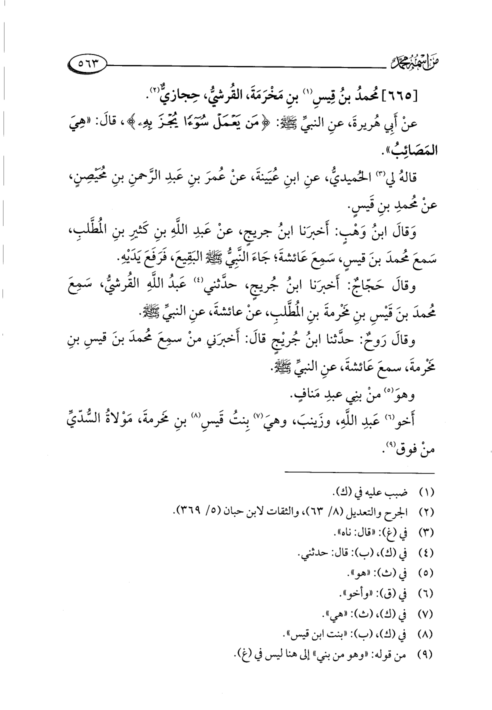 وقالَ حَجّاجٌ: أَخبرَنا ابنُ جُريجٍ، حدَّثني (¬٤) عَبدُ اللَّهِ القُرشيُّ، سَمِعَ مُحمدَ بنَ قَيْسِ بنِ مَخْرمةَ بنِ المُطَّلبِ، عنْ عائشةَ، عنِ النبيِّ -صلى اللَّه عليه وسلم-.