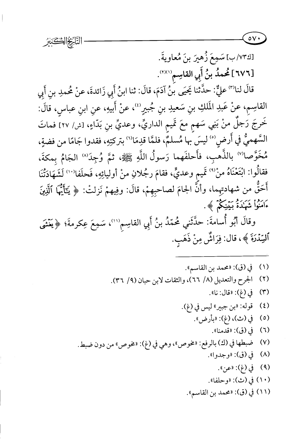 قالَ لنا (¬٣) عليٌّ: حدَّثنا يَحيَى بنُ آدَمَ، قالَ: ثنا ابنُ أَبِي زَائدةَ، عنْ مُحمدِ بنِ أَبِي القاسِمِ، عنْ عَبدِ المَلكِ بنِ سَعيدِ بنِ جُبيرٍ (¬٤)، عنْ أَبيهِ، عنِ ابنِ عباسٍ، قالَ: خَرجَ رَجلٌ منْ بَنِي سَهمٍ معَ تمَيمٍ الداريِّ، وعديِّ بنِ بَدّاءٍ، فماتَ السَّهميُّ في أَرضٍ (¬٥) ليسَ بها مُسلمٌ، فلمَّا قدِمَا (¬٦) بتركتِهِ، فقدوا جَامًا من فضةٍ، مُخَوَّصا (¬٧) بالذَّهبِ، فأَحلفَهما رَسولُ اللَّهِ -صلى اللَّه عليه وسلم-، ثمَّ وُجِدَ (¬٨) الجَامُ بِمكةَ، فقالُوا: ابْتَعْنَاهُ منْ (¬٩) تمَيمِ وعديٍّ، فقامَ رجُلانِ منْ أوليائِهِ، فَحلَفا (¬١٠) لَشَهَادَتُنَا أَحَقُّ من شهادتهِما، وأنَّ الجامَ لصاحبِهِمْ، قالَ: وفِيهمْ نَزلتْ: {يَاأَيُّهَا الَّذِينَ آمَنُوا شَهَادَةُ بَيْنِكُمْ}.