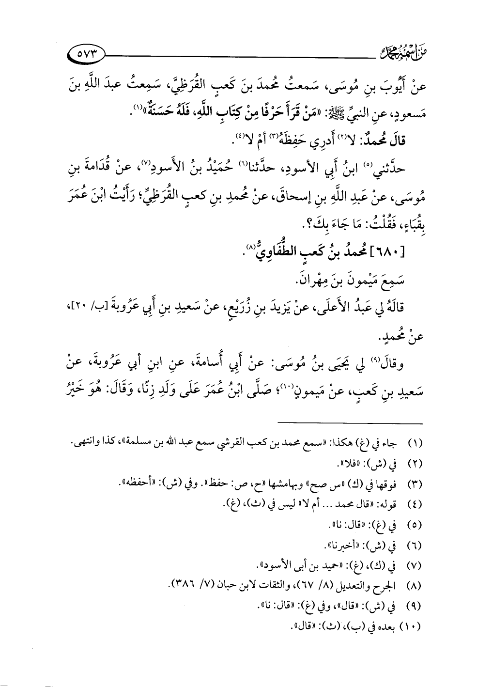 عنْ أَيُّوبَ بنِ مُوسَى، سَمعتُ مُحمدَ بنَ كَعبٍ القُرَظِيَّ، سَمِعتُ عبدَ اللَّهِ بنَ مَسعودٍ، عنِ النبيِّ -صلى اللَّه عليه وسلم-: "مَنْ قَرَأَ حَرْفًا مِنْ كِتَابِ اللَّهِ، فَلَهُ حَسَنَةٌ" (¬١).