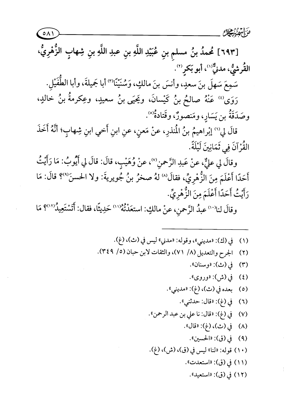 [٦٩٣] مُحمدُ بنُ مسلمِ بنِ عُبَيْدِ اللَّهِ بنِ عبدِ اللَّهِ بنِ شِهابٍ الزُّهْرِيُّ، القُرشيُّ، مدنيٌّ (¬١)، أبو بَكرٍ (¬٢).
