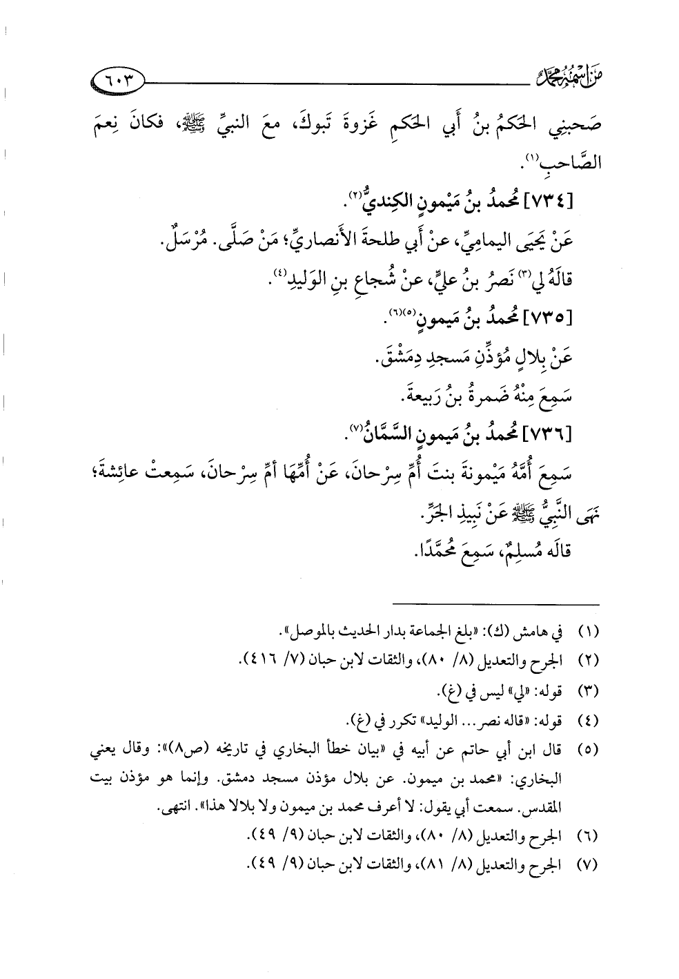 (¬٥) قال ابن أبي حاتم عن أبيه في "بيان خطأ البخاري في تاريخه (ص ٨) ": وقال يعني البخاري: "محمد بن ميمون. عن بلال مؤذن مسجد دمشق. وإنما هو مؤذن بيت المقدس. سمعت أبي يقول: لا أعرف محمد بن ميمون ولا بلالا هذا". انتهى.