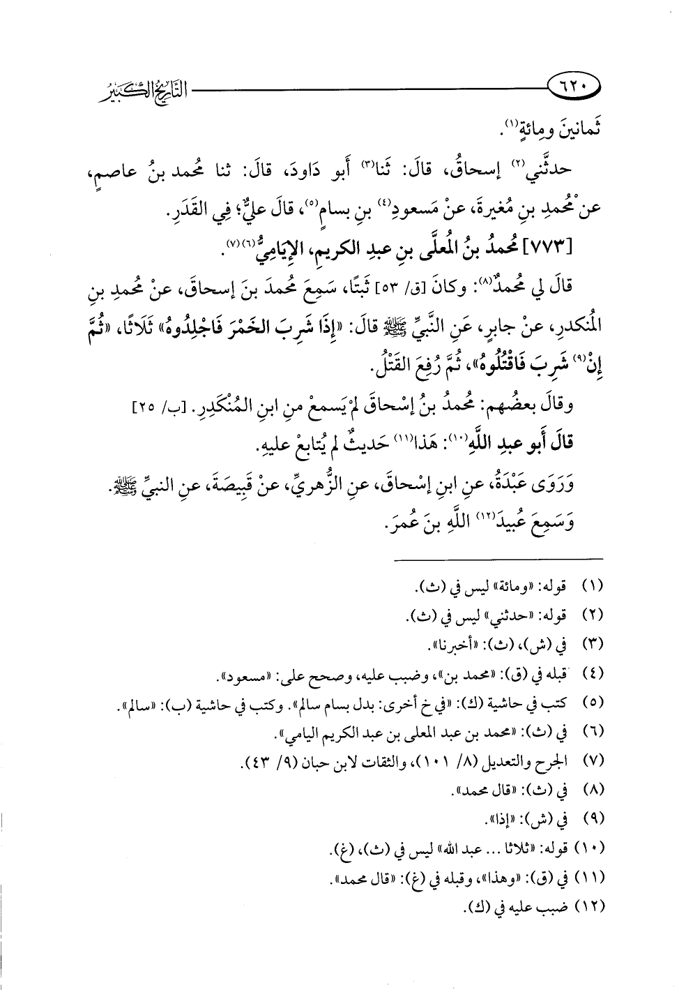 حدثَّني (¬٢) إسحاقُ، قالَ: ثَنا (¬٣) أَبُو دَاودَ، قالَ: ثنا مُحمد بنُ عاصمٍ، عنْ مُحمدِ بنِ مُغيرةَ، عنْ مَسعودِ (¬٤) بنِ بسامٍ (¬٥)، قالَ عليٌّ؛ في القَدَرِ.