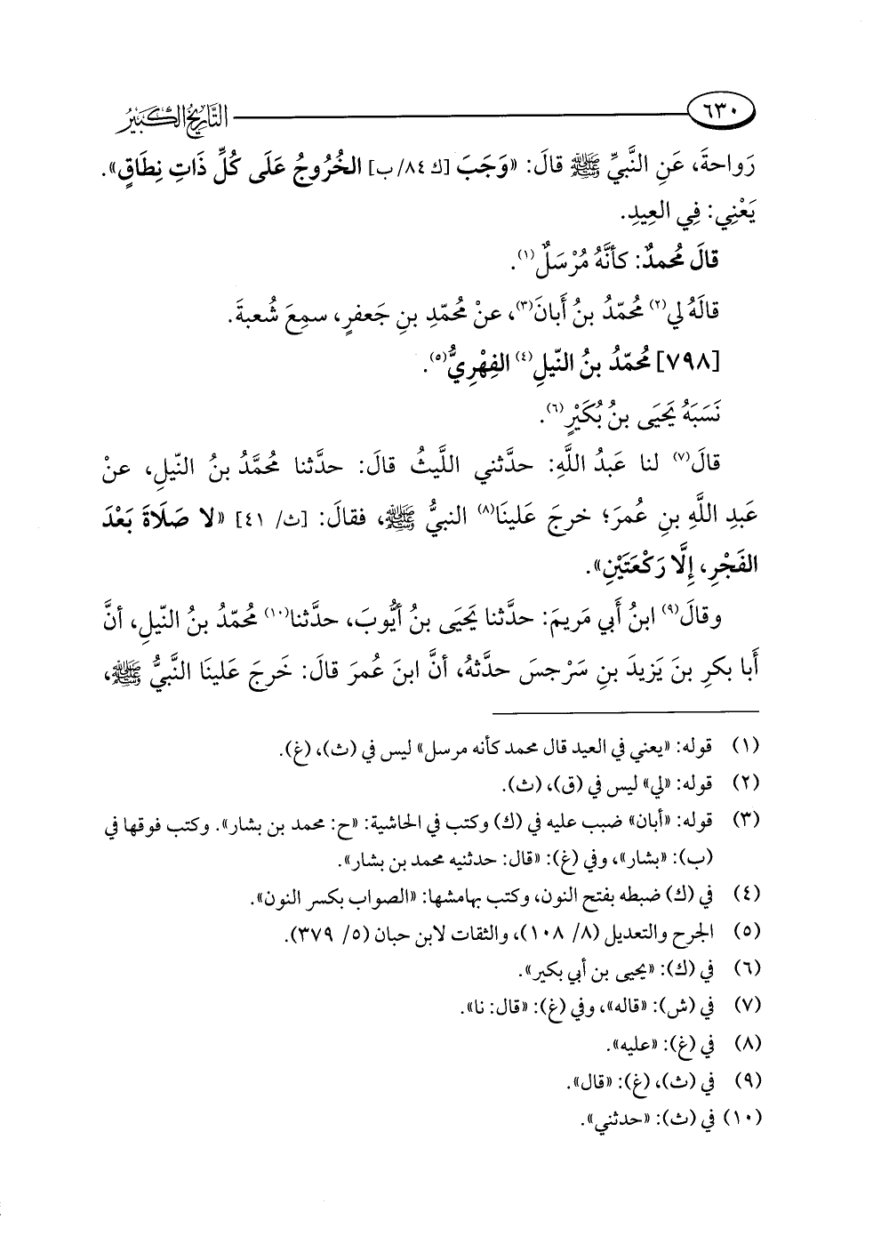 قالَ (¬٧) لنا عَبدُ اللَّهِ: حدَّثني اللَّيثُ قالَ: حدَّثنا مُحمَّدُ بنُ النّيلِ، عنْ عَبدِ اللَّهِ بنِ عُمرَ؛ خرجَ عَلينَا (¬٨) النبيُّ -صلى اللَّه عليه وسلم-، فقالَ: "لا صَلَاةَ بَعْدَ الفَجْرِ، إِلَّا رَكْعَتَيْنِ".