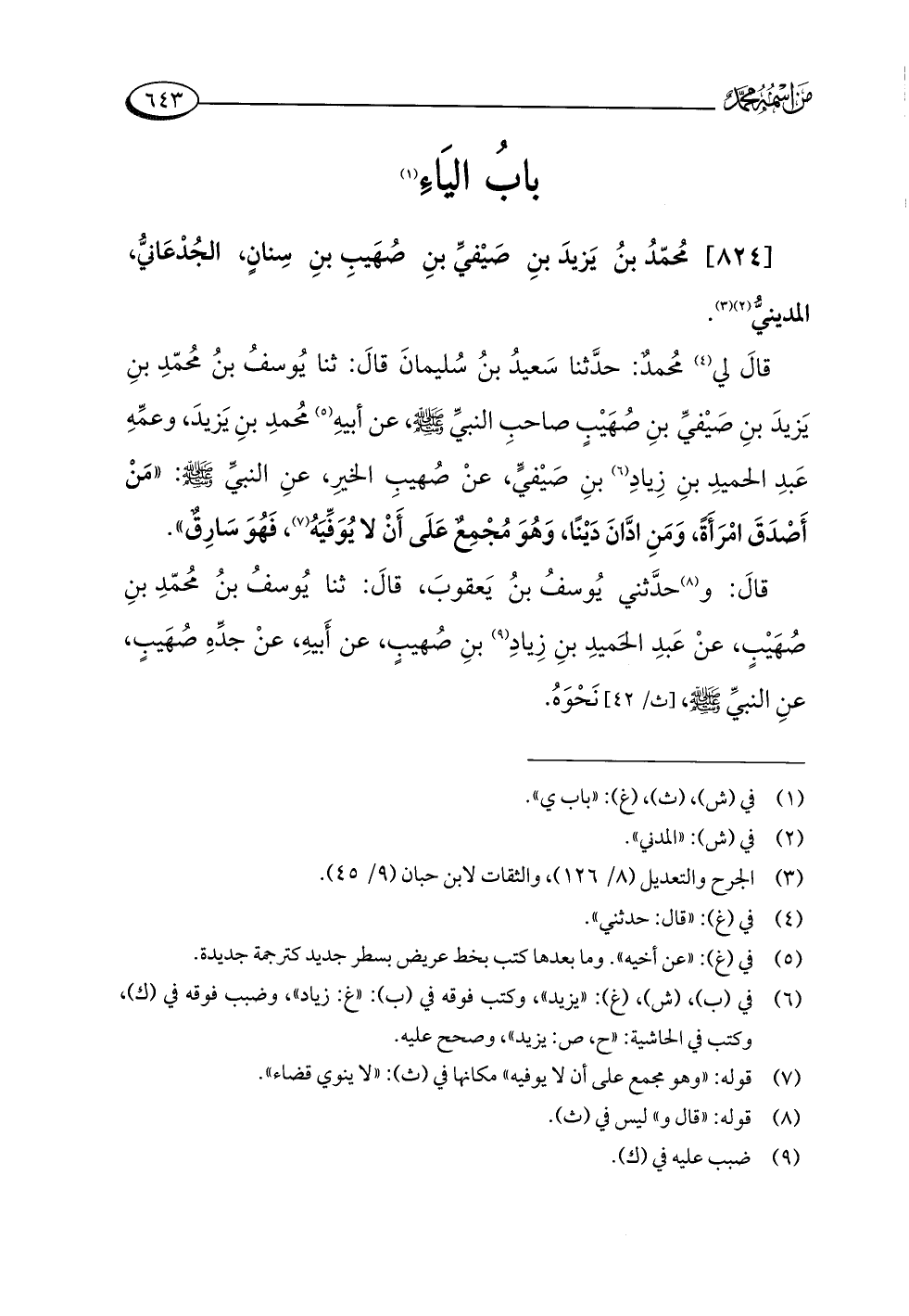 قالَ لي (¬٤) مُحمدٌ: حدَّثنا سَعيدُ بنُ سُليمانَ قالَ: ثنا يُوسفُ بنُ مُحمّدِ بنِ يَزيدَ بنِ صَيْفيِّ بنِ صُهَيْبٍ صاحبِ النبيِّ -صلى اللَّه عليه وسلم-، عن أبيهِ (¬٥) مُحمدِ بنِ يَزيدَ، وعمِّهِ عَبدِ الحميدِ بنِ زِيادِ (¬٦) بنِ صَيْفيٍّ، عنْ صُهيبِ الخيرِ، عنِ النبيِّ -صلى اللَّه عليه وسلم-: "مَنْ أَصْدَقَ امْرَأَةً، وَمَنِ ادَّانَ دَيْنًا، وَهُوَ مُجْمِعٌ عَلَى أَنْ لا يُوَفِّيَهُ (¬٧)، فَهُوَ سَارِقٌ".