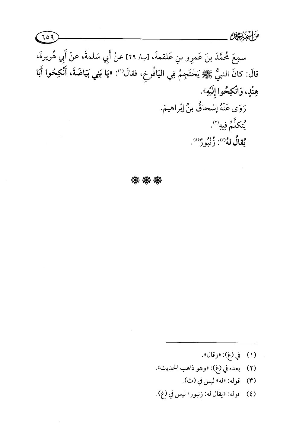 سمِعَ مُحمَّدَ بنَ عَمرِو بنِ عَلقمةَ، عنْ أَبِي سَلمةَ، عنْ أَبِي هُريرةَ، قالَ: كانَ النبيُّ -صلى اللَّه عليه وسلم- يحْتَجِمُ فِي اليَافُوخِ، فقالَ (¬١): "يَا بَنِي بَيَاضَةَ، أَنْكِحُوا أَبَا هِنْدٍ، وَانْكِحُوا إِلَيْهِ".