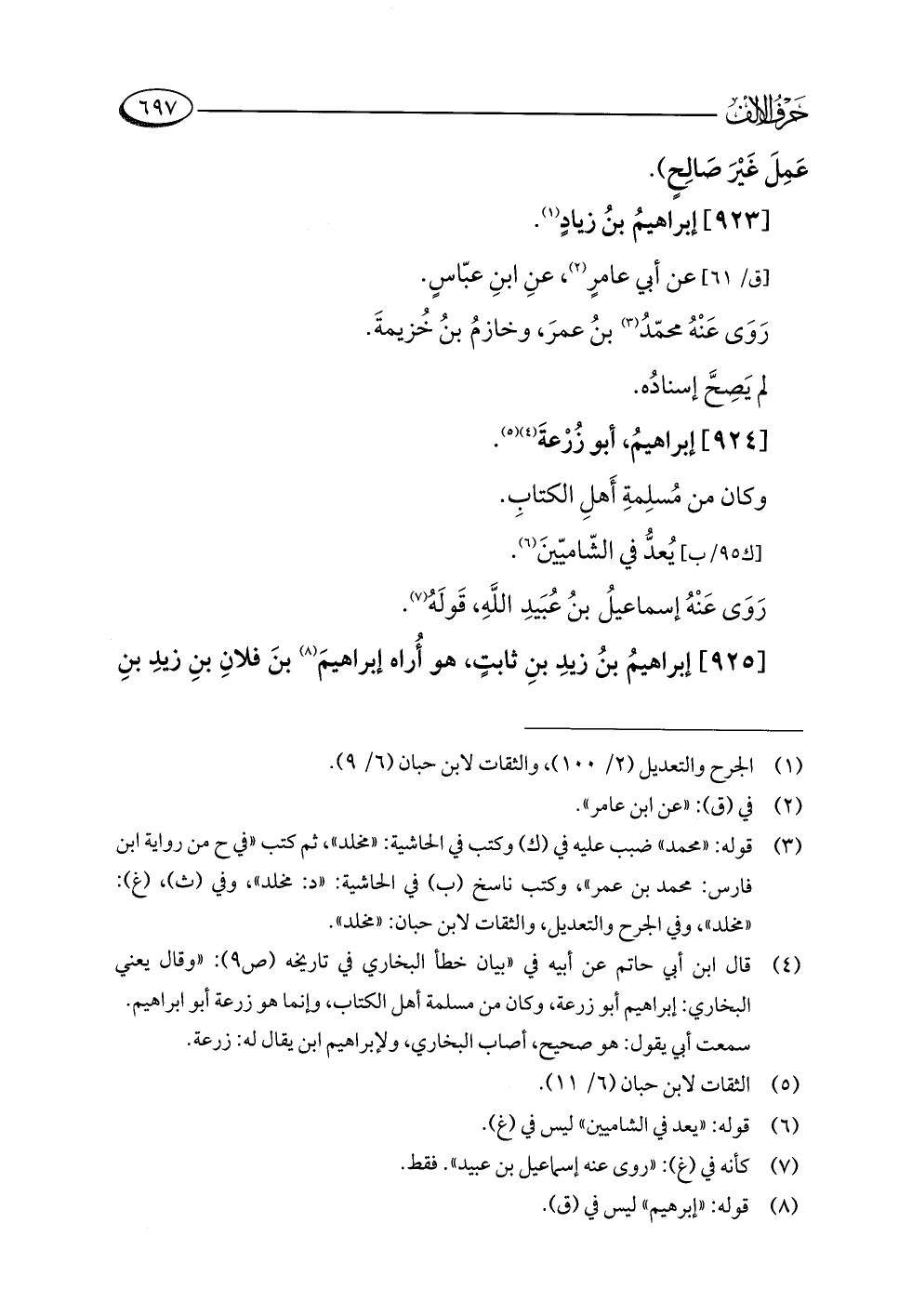 (¬٤) قال ابن أبي حاتم عن أبيه في "بيان خطأ البخاري في تاريخه (ص ٩): "وقال يعني البخاري: إبراهيم أبو زرعة، وكان من مسلمة أهل الكتاب، وإنما هو زرعة أبو ابراهيم. سمعت أبي يقول: هو صحيح، أصاب البخاري، ولإبراهيم ابن يقال له: زرعة.