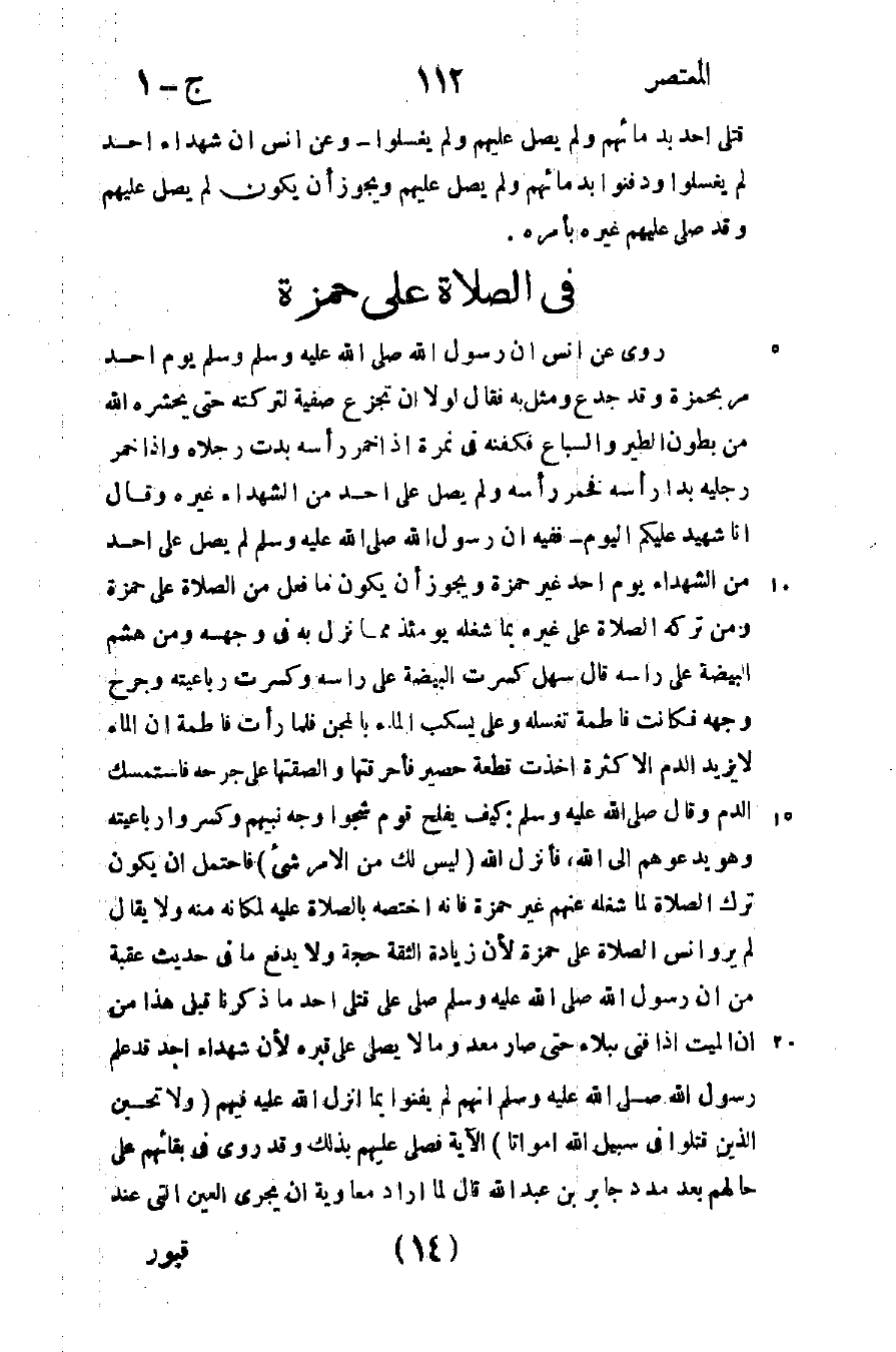 روى عن أنس أن رسول الله صلى الله عليه وسلم يوم أحد مر بحمزة وقد جدع ومثل به فقال: "لولا أن تجزع صفية لتركته حتى يحشره الله من بطون الطير والسباع" فكفنه في نمرة إذا خمر رأسه بدت رجلاه وإذا خمر رجليه بدا رأسه فخمر رأسه ولم يصل على أحد من الشهداء غيره وقال: "أنا شهيد عليكم اليوم" ففيه أن رسول الله صلى الله عليه وسلم لم يصل على أحد من الشهداء يوم أحد غير حمزة ويجوز أن يكون ما فعل من الصلاة على حمزة ومن تركه الصلاة على غيره بما شغله يومئذ مما نزل به في وجهه ومن هشم البيضة على رأسه قال سهل: كسرت البيضة على رأسه وكسرت رباعيته وجرح وجهه فكانت فاطمة تغسله وعلي يسكب الماء بالمجن فلما رأت فاطمة أن الماء لا يزيد الدم إلا كثرة أخذت قطعة حصير فأحرقتها وألصقتها على جرحه فاستمسك الدم وقال صلى الله عليه وسلم: "كيف يفلح قوم شجوا وجه نبيهم وكسروا رباعيته وهو يدعوهم إلى الله" فأنزل الله: {لَيْسَ لَكَ مِنَ الْأَمْرِ شَيْءٌ} فاحتمل أن يكون ترك الصلاة لما شغله عنهم غير حمزة فإنه اختصه بالصلاة عليه لمكانه منه ولا يقال لم يرو أنس الصلاة على حمزة لأن زيادة الثقة حجة ولا يدفع ما في حديث عقبة من أن رسول الله صلى الله عليه وسلم صلى على قتلى أحد ما ذكرنا قبل هذا أن الميت إذا فنى بلاء حتى صار معدوما لا يصلى على قبره لأن شهداء أحد قد علم رسول الله صلى الله عليه وسلم أنهم لم يفنوا بما أنزل الله عليه فيهم: {وَلا تَحْسَبَنَّ الَّذِينَ قُتِلُوا فِي سَبِيلِ اللَّهِ أَمْوَاتاً} الآية فصلى عليهم بذلك وقد روى في بقائهم على حالهم بعد مدد جابر بن عبد الله قال: لما أراد معاوية أن يجري العين التي عند قبور الشهداء بالمدينة أمر مناديا فنادى من كان له ميت فليأته قال جابر فذهبت إلى أبي فأخرجناهم رطبا فأصابت المسحاة أصبع رجل منهم فانقطرت دما فهكذا نقول من علم بقاء بدنه بعد مدة وإن طالت في قبره جاز أن يصلى على قبره إذ لم يكن صلى عليه قبل دفنه اقتداء برسول الله صلى الله عليه وسلم في ذلك واتباعا له.