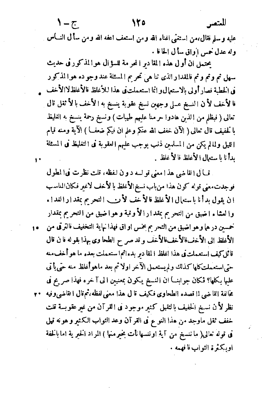 قال القاضي: هذا معنى قوله دون لفظه قلت: نظرت في المطول فوجدت معنى قوله كون هذا من باب نسخ الأغلظ بالأخف لا غير فكان المناسب أن يقول بدأنا باستعمال الأغلظ فالأخف لأن التحريم بمقدار الغداء والعشاء أضيق من التحريم بمقدار الأوقية وهو أضيق من التحريم بمقدار خمسين درهما وهو أضيق من التحريم بخمس أواق فهذا نهاية التخفيف فالترقي من الأغلظ إلى الأخف فالأخف فالأخف وقد صرح الطحاوي بهذا بقوله فإن قال قائل: كيف استعملت في هذا أغلظ المقادير بدء ثم استعملت بعده ما هو أخف منه حتى استعملت كلها كذلك ولم يستعمل الآخر أولا ثم بعد ما هو أغلظ منه حتى يأتي عليها بكلها؟ فكان جوابنا: أن النسخ يكون بمعنيين إلى آخره فهذا صريح في مخالفة القاضي لما قصده الطحاوي فكيف قال هذا معنى لفظه ثم قال القاضي: وفيه نظر لأنه نسخ الخفيف بالثقيل كثير موجود في القرآن وعد الثواب الكثير من غير عقوبة قلت: خفف ثقل ما وجد من هذا النوع في القرآن وعد الثواب الكثير وهو نه قيل في قوله تعالى: {مَا نَنْسَخْ مِنْ آيَةٍ أَوْ نُنْسِهَا نَأْتِ بِخَيْرٍ مِنْهَا} المراد الخيرية أما بالخفة أو بكثرة الثواب فافهمه.