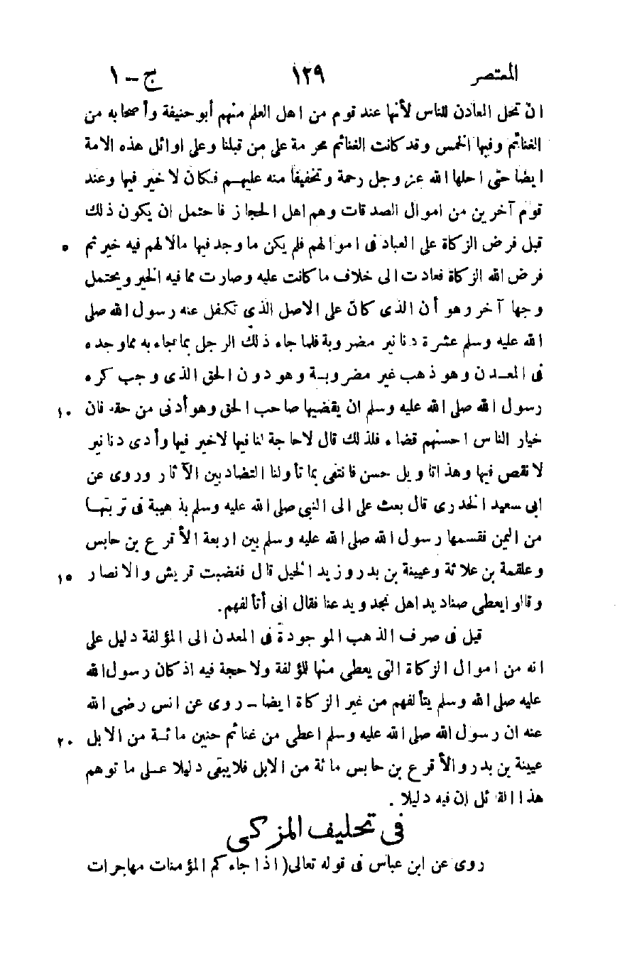 أن تحل المعادن للناس لأنها عند قوم من أهل العلم منهم أبو حنيفة وأصحابه من الغنائم وفيها الخمس وقد كانت الغنائم محرمة على من قبلنا وعلى أوائل هذه الأمة أيضا حتى أحلها الله عز وجل رحمة وتخفيفا منه عليهم فكان لا خير فيها وعند قوم آخرين من أموال الصدقات وهم أهل الحجاز فاحتمل أن يكون ذلك قبل فرض الزكاة على العباد في أموالهم فلم يكن ما وجد فيها ما لا لهم فيه خير ثم فرض الله الزكاة فعادت إلى خلاف ما كانت عليه وصارت مما فيه الخير ويحتمل وجها آخر وهو أن الذي كان على الأصل الذي تكفل عنه رسول الله صلى الله عليه وسلم عشرة دنانير مضروبة فلما جاء ذلك الرجل بما جاءه به مما وجده في المعدن وهو ذهب غير مضروبة وهو دون الحق الذي وجب كره رسول الله صلى الله عليه وسلم أن يقضيها صاحب الحق وهو أدنى من حقه فإن خيار الناس أحسنهم قضاء فلذلك قال: "لا حاجة لنا فيها لا خير فيها" وأدى دنانير لا نقص فيها وهذا تأويل حسن فانتفى بما تأولنا التضادين بين الآثار وروى عن أبي سعيد الخدري قال: بعث علي إلى النبي صلى الله عليه وسلم بذهبية في تربتها من اليمن فقسمها رسول الله صلى الله عليه وسلم بين أربعة الأقرع بن حابس وعلقمة بن علاثة وعيينة بن بدر وزيد الخيل قال: فغضبت قريش والأنصار وقالوا: أيعطي صناديد نجد ويدعنا؟ فقال: "إني أتألفهم" قيل في صرف الذهب الموجودة في المعدن إلى المؤلفة دليل على أنه من أموال الزكاة التي يعطى منها للمؤلفة ولا حجة فيه إذ كان رسول الله صلى الله عليه وسلم يتألفهم من غير الزكاة أيضا روى عن أنس رضي الله عنه أن رسول الله صلى الله عليه وسلم أعطى من غنائم حنين مائة من الإبل عيينة بن بدر والأقرع بن حابس مائة من الإبل فلا يبقى دليلا على ما توهم هذا القائل أن فيه دليلا.