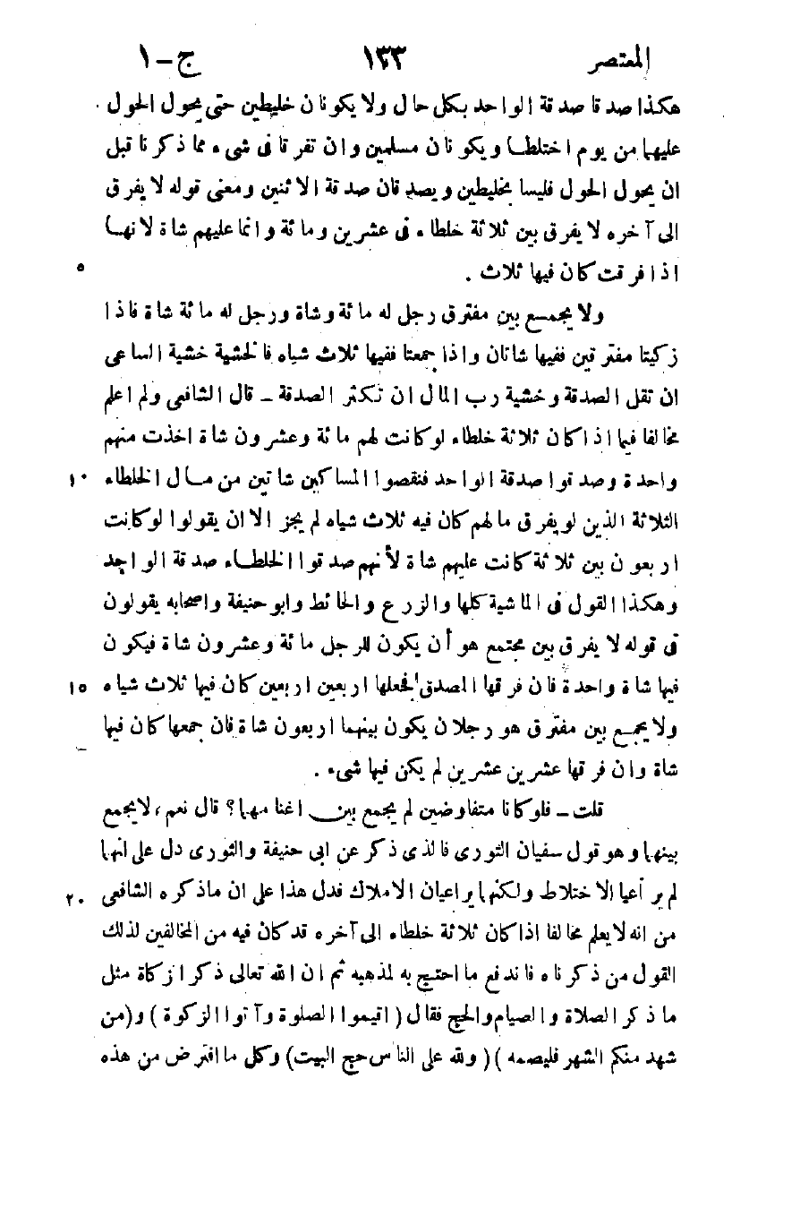 قلت فلو كانا متفاوضين لم يجمع بين أغنامها قال: نعم لا يجمع بينهما وهو قول سفيان الثوري فالذي ذكر عن أبي حنيفة والثوري دل على أنهما لم يراعيا الاختلاط ولكنهما يراعيان الأملاك فدل هذا على أن ما ذكره الشافعي من أنه لا يعلم مخالفا إذا كان ثلاثة خلطاء إلى آخره قد كان فيه من المخالفين لذلك القول من ذكرناه فاندفع ما احتج به لمذهبه ثم إن الله تعالى ذكر الزكاة مثل ما ذكر الصلاة والصيام والحج فقال: {وَأَقِيمُوا الصَّلاةَ وَآتُوا الزَّكَاةَ} و {فَمَنْ شَهِدَ مِنْكُمُ الشَّهْرَ فَلْيَصُمْهُ} {وَلِلَّهِ عَلَى النَّاسِ حِجُّ الْبَيْتِ} وكل ما افترض من هذه