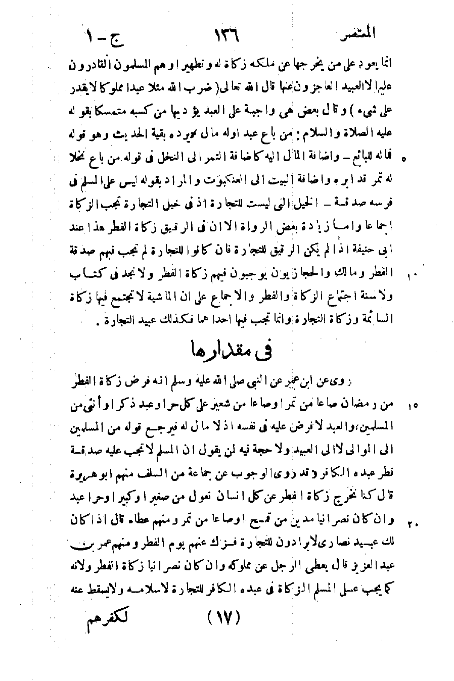 روى عن ابن عمر عن النبي صلى الله عليه وسلم: "أنه فرض زكاة الفطر من رمضان صاعا من تمر أو صاعا من شعير على كل حر أو عبد ذكر أو أنثى من المسلمين" والعبد لا فرض عليه في نفسه إذ لا مال له فيرجع قوله: "من المسلمين" إلى الموالي لا إلى العبيد ولا حجة فيه لمن يقول أن المسلم لا تجب عليه صدقة فطر عبده الكافر وقد روى الوجوب عن جماعة من السلف منهم أبو هريرة قال كنا نخرج زكاة الفطر عن كل إنسان نعول من صغير أو كبير أو حر أو عبد وإن كان نصرانيا مدين من قمح أو صاعا من تمر ومنهم عطاء قال إذا كان لك عبيد نصارى لا يرادون للتجارة فزك عنهم يوم الفطر ومنهم عمر بن عبد العزيز قال يعطي الرجل عن مملوكه وإن كان نصرانيا زكاة الفطر ولأنه كما يجب على المسلم الزكاة في عبده الكافر للتجارة لإسلامه ولا يسقط عن لكفرهم وجب أن يؤدى عنهم زكاة الفطر لإسلامه ولا يمنع عن ذلك كفرهم وهو مذهب أبي حنيفة وأصحابه.