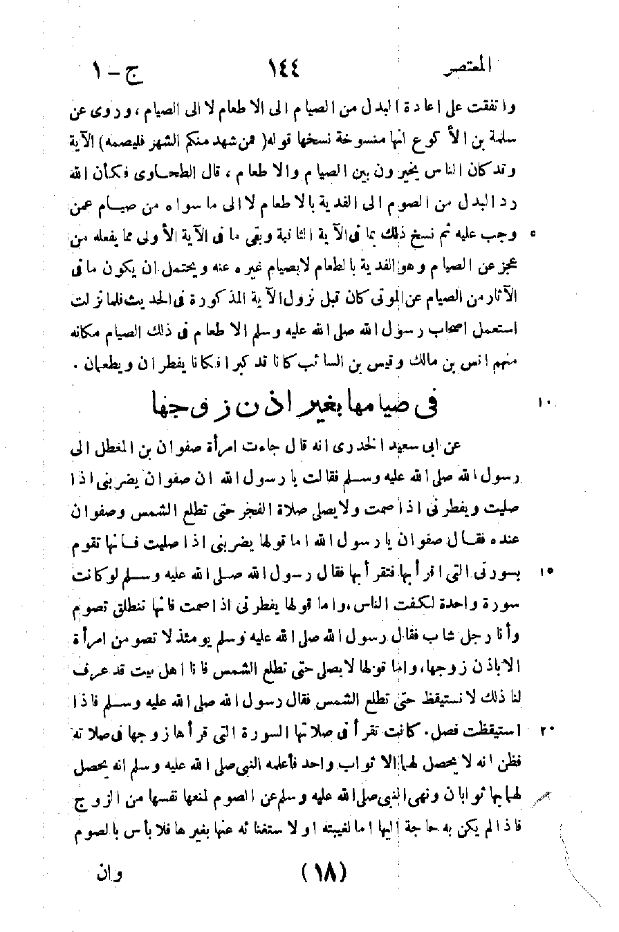 عن أبي سعيد الخدري أنه قال: جاءت امرأة صفوان بن المعطل إلى رسول الله صلى الله عليه وسلم فقالت: يا رسول الله إن صفوان يضربني إذا صليت ويفطرني إذا صمت, ولا يصلي صلاة الفجر حتى تطلع الشمس وصفوان عنده, فقال صفوان: يا رسول الله أما قولها يضربني إذا صليت, فإنها تقوم بسورتي التي أقرأ بها فتقرأ بها, فقال رسول الله صلى الله عليه وسلم: "لو كانت سورة واحدة لكفت الناس" وأما قولها: يفطرني إذا صمت فإنها تنطلق تصوم وأنا رجل شاب, فقال رسول الله صلى الله عليه وسلم: "يومئذ لا تصومن امرأة إلأ بإذن زوجها" وأما قولها: لا يصلي حتى تطلع الشمس فأنا أهل بيت قد عرف لنا ذلك لا نستيقظ حتى تطلع الشمس فقال رسول الله صلى الله عليه وسلم: "فإذا استيقظت فصل" كانت تقرأ في صلاتها السورة التي قرأها زوجها في صلاته فظن أنه لا يحصل لهما إلا ثواب واحد فأعلمه النبي صلى الله عليه وسلم أنه يحصل لهما بها ثوابان ونهى النبي صلى الله عليه وسلم عن الصوم لمنعها نفسها من الزوج فإذا لم يكن به حاجة إليها إما لغيبته أو لاستغنائه عنها بغيرها فلا بأس بالصوم