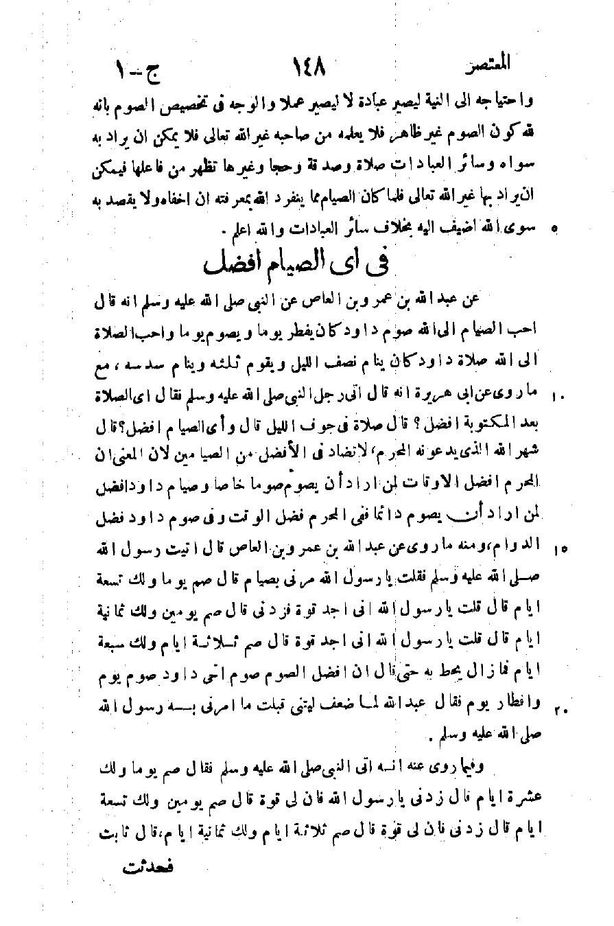 عن عبد الله بن عمرو بن العاص عن النبي صلى الله عليه وسلم قال: "أحب الصيام إلى الله صوم داود كان يفطر يوما ويصوم يوما وأحب الصلاة إلى الله صلاة داود كان ينام نصف الليل ويقوم ثلثه وينام سدسه" مع ما روى عن أبي هريرة أنه قال: أتى رجل إلى النبي صلى الله عليه وسلم فقال: أي الصلاة بعد المكتوبة أفضل؟ قال: "صلاة في جوف الليل" قال: وأي الصيام أفضل؟ قال: "شهر الله الذي يدعونه المحرم" لا تضاد في الأفضل من الصيامين لأن المعنى أن المحرم أفضل الأوقات لمن أراد أن يصوم صوما خاصا وصيام داود أفضل لمن أراد أن يصوم دائما ففي المحرم فضل الوقت وفي صوم داود فضل الدوام ومنه ما روى عن عبد الله بن عمرو بن العاص قال: أتيت رسول الله صلى الله عليه وسلم فقلت: يا رسول الله مرني بصيام قال: "صم يوما ولك تسعة أيام" قال: قلت يا رسول الله إني أجد قوة فزدني قال: "صم يومين ولك ثمانية أيام" قال: قلت: يا رسول الله إني أجد قوة, قال: "صم ثلاثة أيام ولك سبعة أيام" فما زال يحط به حتى قال: "إن أفضل الصوم صوم أخي داود صوم يوم وافطار يوم" فقال عبد الله لما ضعف: ليتني قبلت ما أمرني به رسول الله صلى الله عليه وسلم.