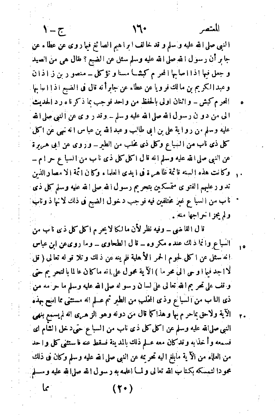 النبي صلى الله عليه وسلم وقد خالف إبراهيم الصائغ فيما روى عن عطاء عن جابر أن رسول الله صلى الله عليه وسلم سئل عن الضبع فقال: هي من الصيد وجعل فيها إذا أصابها المحرم كبشا مسنا وتؤكل منصور بن زاذان وعبد الكريم بن مالك فرويا عن عطاء عن جابر أنه قال في الضبع إذا أصابها المحرم كبش واثنان أولى بالحفظ من واحد فوجب بما ذكرناه رد الحديث إلى من دون رسول الله صلى الله عليه وسلم وقد روى عن النبي صلى الله عليه وسلم من رواية علي بن أبي طالب وعبد الله بن عباس أنه نهى عن أكل كل ذي ناب من السباع وكل ذي مخلب من الطير وروى عن أبي هريرة عن النبي صلى الله عليه وسلم أنه قال: "أكل كل ذي ناب من السباع حرام" وكانت هذه السنة قائمة ظاهرة في أيدي العلماء وكان أئمة الأمصار الذين تدور عليهم الفتوى متمسكين بتحريم رسول الله صلى الله عليه وسلم كل ذي ناب من السباع غير مختلفين فيه فوجب دخول الضبع في ذلك لأنها ذو ناب ولم يجز إخراجها منه.