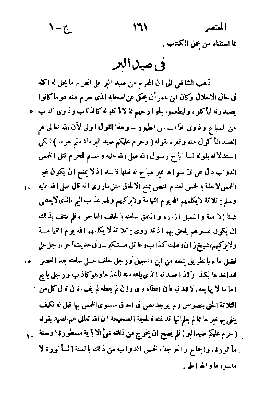 ذهب الشافعي إلى أن المحرم من صيد البر ما يحل له أكله في حال الإحلال وكان ابن عمر أن يحكي عن أصحابه الذي حرم منه ما كانوا يصيدونه ليأكلوه وليطعموا لجوارحهم مما يأكلونه كالذئاب وذوي الناب من السباع وذوي المخالب من الطيور وهذا القول أولى لأن الله تعالى عم الصيد المأكول منه وغيره بقوله: {وَحُرِّمَ عَلَيْكُمْ صَيْدُ الْبَرِّ مَا دُمْتُمْ حُرُماً} لكن استدلاله بقوله لما أباح رسول الله صلى الله عليه وسلم للمحرم قتل الخمس الدواب دل على أن سواها غير مباح له قتلها فاسد إذ لا يمتنع أن يكون غير الخمس لاحقة بالخمس لعدم النص بمنع الالحاق مثل ما روى أنه قال صلى الله عليه وسلم: "ثلاثة لا يكلمهم الله يوم القيامة ولا يزكيهم ولهم عذاب أليم الذي لا يعطي شيئا إلا منه والمسبل إزاره والمنفق سلعته بالحلف الفاجر" فلم ينتف بذلك أن يكون غيرهم يلحق بهم إذ قد روى ثلاثة لا يكلمهم الله يوم القيامة ولا يزكيهم شيخ زان وملك كذاب وعائل مستكبر وفي حديث آخر رجل على فضل ماء بالطريق يمنعه من ابن السبيل ورجل حلف على سلعته بعد العصر لقد أخذها بكذا وكذا فصدقه الذي باعه منه فأخذها وهو كاذب ورجل بايع إمامه لا يبايعه إلا للدنيا فإن أعطاه وفى وإن لم يعطه لم يف فإن قال كل من الثلاثة الحق بنصوص ولم يوجد نص في الحاق ما سوى الخمس بها قيل له فكيف ينفي بها غيرها مما لم يعلم أنها قد نفته فالحجة الصحيحة أن الله تعالى عم الصيد بقوله: {وَحُرِّمَ عَلَيْكُمْ صَيْدُ الْبَرِّ} فلم يصح أن يخرج من ذلك شيء إلا بآية مسطورة أو سنة مأثورة أو اجماع وأخرجنا الخمس الدواب من ذلك بالسنة المأثورة ولا ما سواها والله أعلم.