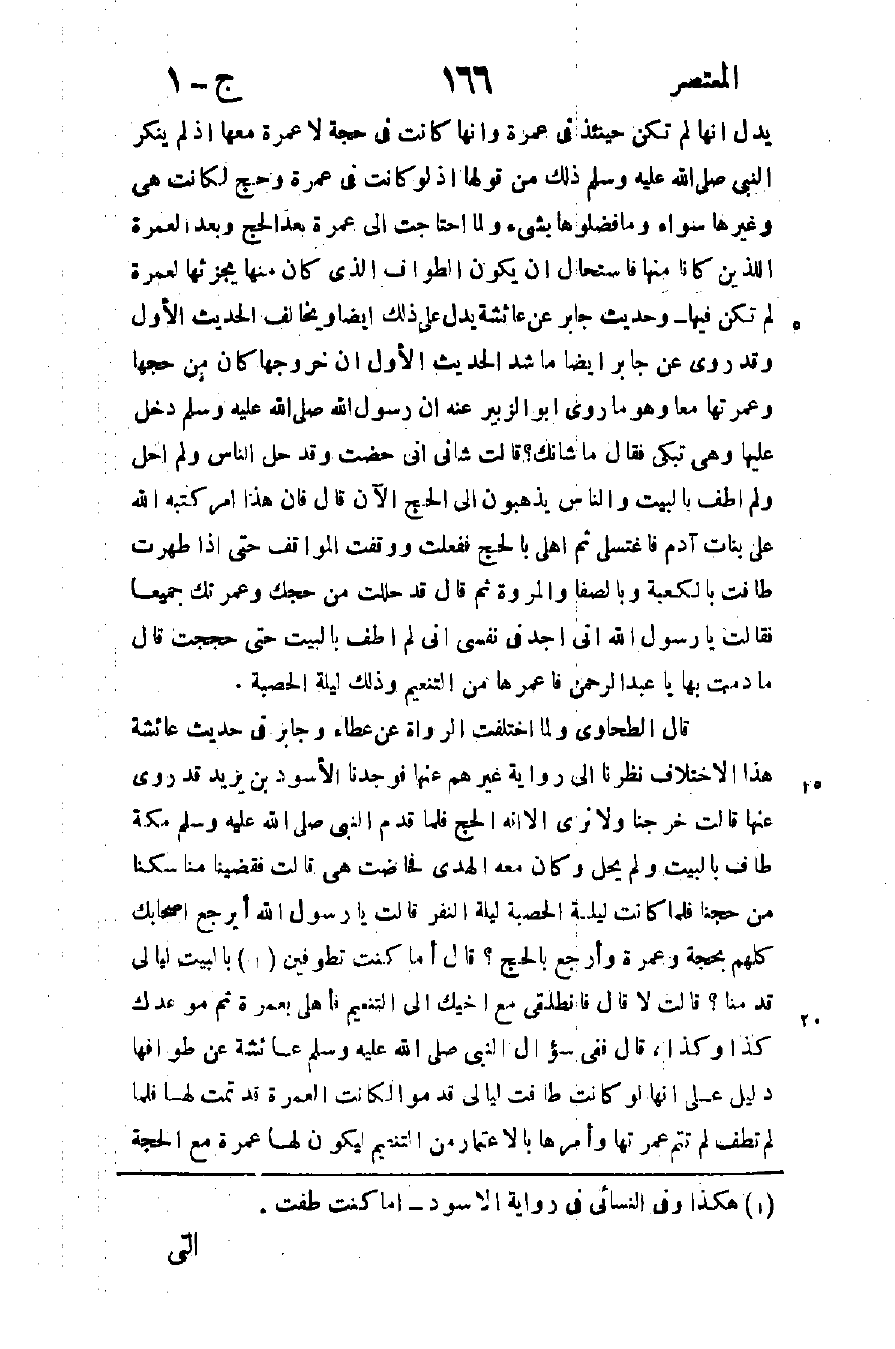 قال الطحاوي ولما اختلفت الرواة عن عطاء وجابر في حديث عائشة هذا الاختلاف نظرنا إلى رواية غيرهم عنها فوجدنا الأسود بن يزيد قد روى عنها قالت خرجنا ولا نرى إلا أنه الحج فلما قدم النبي صلى الله عليه وسلم مكة طاف بالبيت ولم يحل وكان معه الهدي فحاضت هي قالت: فقضينا مناسكنا من حجنا فلما كانت ليلة الحصبة ليلة النفر قالت: يا رسول الله أيرجع أصحابك كلهم بحجة وعمرة وأرجع بالحج؟ قال: "أما كنت تطوفين 1 بالبيت ليالي قدمنا" قالت: لا, قال: "فانطلقي مع أخيك إلى التنعيم فأهلي بعمرة ثم موعدك كذا وكذا" قال: ففي سؤال النبي صلى الله عليه وسلم عائشة طوافها دليل على أنها لو كانت طافت ليالي قدموا لكانت العمرة قد تمت لها فلما لم تطف لم تتم عمرتها وأمرها بالاعتمار من التنعيم ليكون لها عمرة مع الحجة