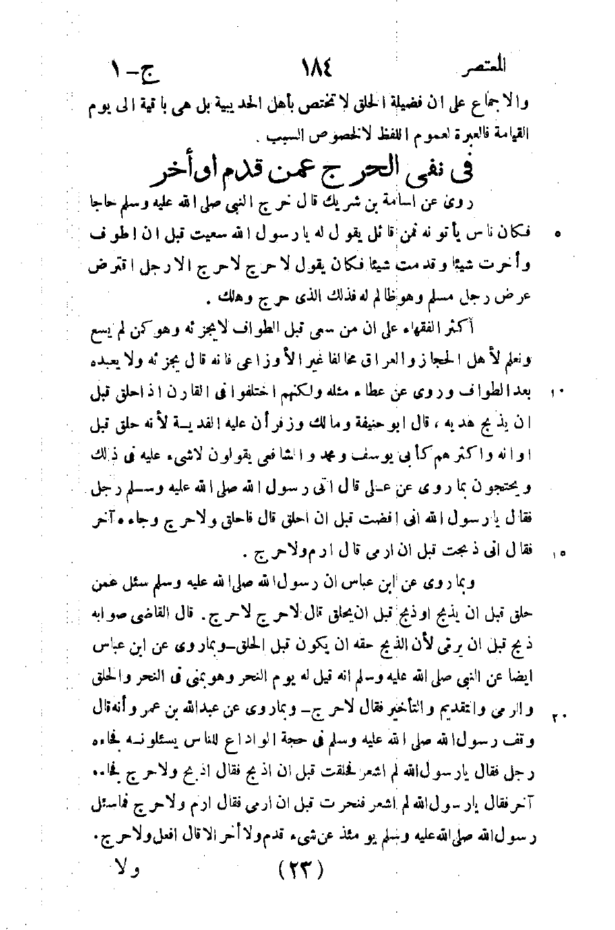 روى عن أسامة بن شريك قال: خرج النبي صلى الله عليه وسلم حاجا فكان ناس يأتونه فمن قائل يقول له: يا رسول الله سعيت قبل أن أطوف: وأخرت شيئا, وقدمت شيئا فكان يقول: "لا حرج لا حرج إلا رجل اقترض عرض رجل مسلم وهو ظالم له فذلك الذي حرج وهلك".