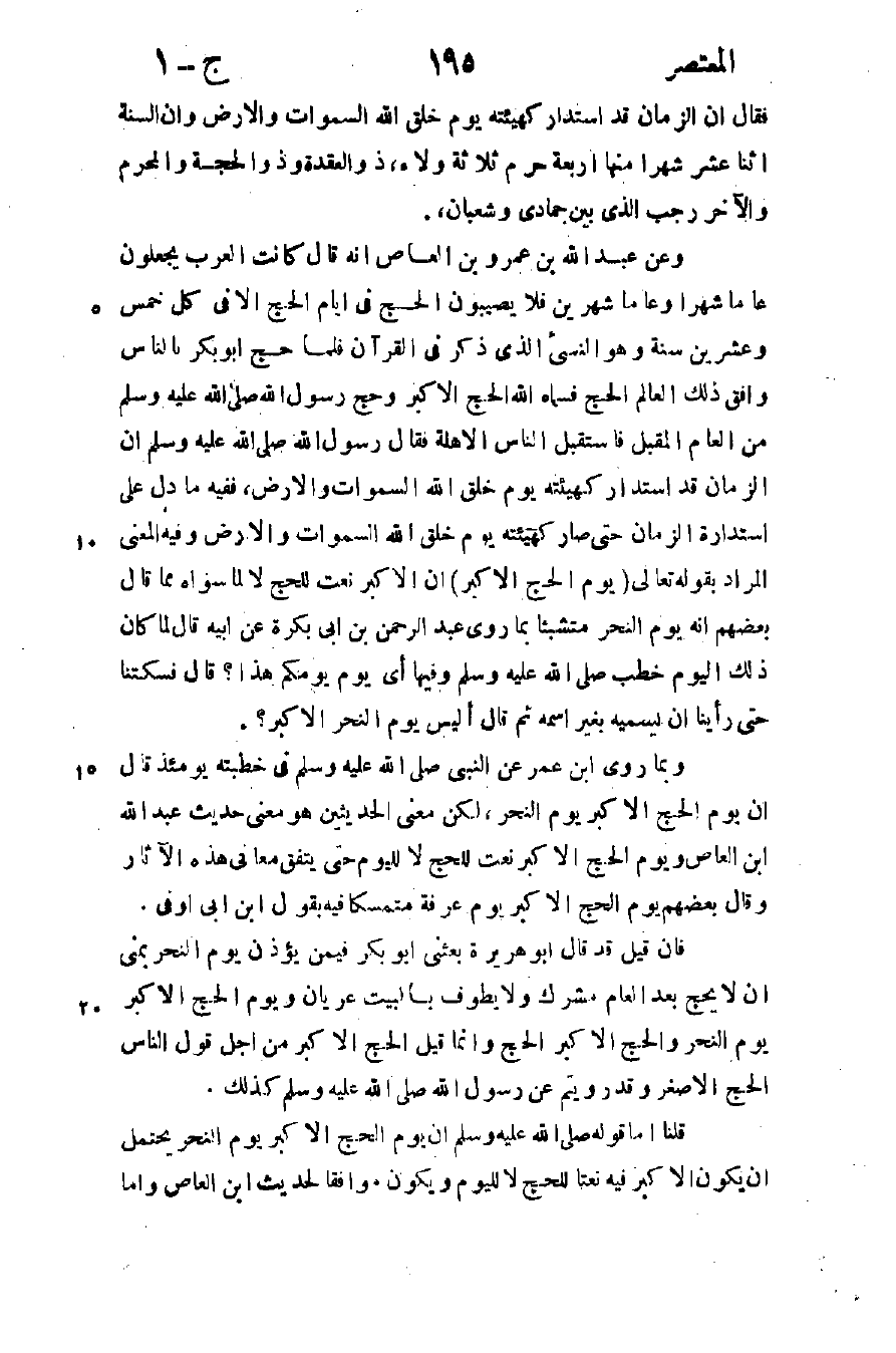 وعن عبد الله بن عمرو بن العاص أنه قال: كانت العرب يجعلون عاما شهرا وعاما شهرين فلا يصيبون الحج في أيام الحج إلا في كل خمس وعشرين سنة وهو النسئ الذي ذكر في القرآن فلما حج أبو بكر بالناس وافق ذلك العالم الحج فسماه الله الحج الأكبر وحج رسول الله صلى الله عليه وسلم من العام المقبل فاستقبل الناس الأهلة فقال رسول الله صلى الله عليه وسلم: "إن الزمان قد استدار كهيئته يوم خلق الله السموات والأرض" ففيه ما دل على استدارة الزمان حتى صار كهيئته يوم خلق الله السموات والأرض وفيه المعنى المراد بقوله تعالى: {يوْمَ الْحَجِّ الْأَكْبَرِ} أن الأكبر نعت للحج لا لما سواه مما قال بعضهم أنه يوم النحر متشبثا بما روى عبد الرحمن بن أبي بكرة عن أبيه قال: لما كان ذلك اليوم خطب صلى الله عليه وسلم وفيها "أي يوم يومكم هذا؟ " قال: فسكتنا حتى رأينا أن يسميه بغير اسمه ثم قال: "أليس يوم النحر الأكبر؟ ".