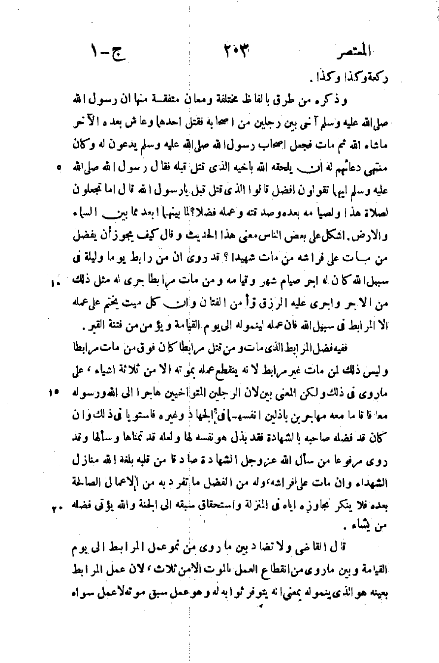 وذكره من طرق بألفاظ مختلفة ومعان متفقة منها أن رسول الله صلى الله عليه وسلم آخى بين رجلين من أصحابه فقتل أحدهما وعاش بعده الآخر ما شاء الله ثم مات فجعل أصحاب رسول الله صلى الله عليه وسلم يدعون له وكان منتهى دعائهم له أن يلحقه الله بأخيه الذي قتل قبله فقال رسول الله صلى الله عليه وسلم: "أيهما تقولون أفضل؟ " قالوا: الذي قتل قبل يا رسول الله قال: "أما تجعلون لصلاة هذا ولصيامه بعده وصدقته وعمله فضلا؟ لما بينهما أبعد مما بين السماء والأرض" أشكل على بعض الناس معنى هذا الحديث وقال كيف يجوز أن يفضل من مات على فراشه من مات شهيدا قد روى "أن من رابط يوما وليلة في سبيل الله كان له أجر صيام شهر وقيامه ومن مات مرابطا جرى له مثل ذلك من الأجر وأجرى عليه الرزق وأمن الفتان وإن كل ميت يختم على عمله إلا المرابط في سبيل الله فإن عمله لينمو له إلى يوم القيامة ويؤمن من فتنة القبر".