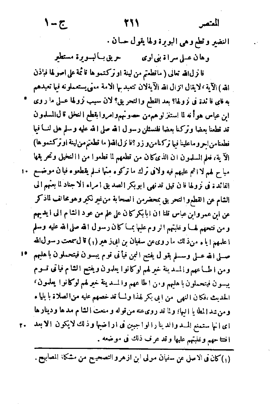 فأنزل الله تعالى: {مَا قَطَعْتُمْ مِنْ لِينَةٍ أَوْ تَرَكْتُمُوهَا قَائِمَةً عَلَى أُصُولِهَا فَبِإِذْنِ اللَّهِ} الآية لا يقال: إنزال الله الآية لأن تتعبد بها الأمة معنى يستعملونه فيما تعبدهم به فأي فائدة في نزولها بعد القطع والتحريق لأن سبب نزولها على ما روى ابن عباس هو أنه لما ساتنزلوهم من حصونهم وأمروا بقطع النخل قال المسلمون قد قطعنا بعضا وتركنا بعضا فلنسئلن رسول الله صلى الله عليه وسلم هل لنا فيما فطعنا من اجرو ما علينا فيما تركنا من وزر فأنزل الله: {مَا قَطَعْتُمْ مِنْ لِينَةٍ أَوْ تَرَكْتُمُوهَا} الآية فعلم المسلمون أن الذي كان من قطعهم لما قطعوا من النخيل وتحريقها مباح لهم لا إثم عليهم فيه ولا في ترك ما تركوه منها فلم يقطعوه فبان موضع الفائدة في نزولها فإن قيل قد نهى أبو بكر الصديق أمراء الأجناد لما بعثهم إلى الشام عن القطع والتحريق بمحضر من الصحابة من غير نكير وهو مخالف لما ذكر عن ابن عمر وابن عباس قلنا: أن أبا بكر كان على علم من عود الشام إلى أيديهم ومن فتحهم لها وغلبتهم الروم عليها بما كان رسول الله صلى الله عليه وسلم أعلمهم إياه من ذلك ما روى عن سفيان بن أبي زهير1 قال سمعت رسول الله صلى الله عليه وسلم يقول: "يفتح اليمن فيأتي قوم يبسون فيتحملون بأهليهم ومن أطاعهم والمدينة خير لهم لو كانوا يعلمون ويفتح الشام فيأتي قوم يبسون فيتحملون بأهليهم ومن أطاعهم والمدينة خير لهم لو كانوا يعلمون" الحديث فكان النهي من أبي بكر لهذا ولما قد خصهم عليه من الصلاة بإيلياء ومن شد المطايا إليها ولما قد روى عنه من قوله: "ومنعت الشام مدها ودينارها" أي أنها ستمنع المد والدينار الواجبين في أراضيها وذلك لا يكون إلا بعد افتتاحهم وغلبتهم عليها وقد عرف ذلك في موضعه.