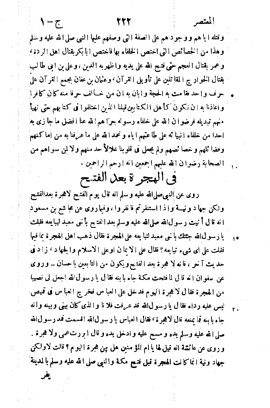 روى عن النبي صلى الله عليه وسلم أنه قال يوم الفتح: "لا هجرة بعد الفتح ولكن جهاد ونية وإذا استنفرتم فانفروا" وفيما روى عن مجاشع بن مسعود أنه قال أتيت رسول الله صلى الله عليه وسلم بعد الفتح بأخي معبد ليبايعه فقلت: يا رسول الله جئتك بأخي معبد لتبايعه على الهجرة, فقال: "ذهب أهل الهجرة بما فيها" فقلت: على أي شيء تبايعه؟ فقال: "على الإيمان أو على الإسلام والجهاد" زاد في حديث آخر: "فإنه لا هجرة بعد الفتح ويكون من التابعين بإحسان" وروى عن صفوان أنه قال: لما فتحت مكة جاء بابنه فقال: يا رسول الله اجعل لي نصيبا من الهجرة فقال: "لا هجرة اليوم" فدخل على العباس فخرج العباس في قميص ليس عليه رداء فقال: يا رسول الله قد عرفت فلانا والذي كان بيني وبنيه وأنه جاء بابنه فما يمنعه قال: "لا هجرة" فقال العباس: يا رسول الله أقسمت فمد رسول الله صلى الله عليه وسلم يده ومسح عليه وأدخل يديه وقال: "أبررت عمي ولا هجرة" وروي عن عائشة أنه قيل لها: يا أم المؤمنين هل من هجرة اليوم قالت: لا ولكن جهاد ونية إنما كانت الهجرة قبل فتح مكة والنبي صلى الله عليه وسلم بالمدينة