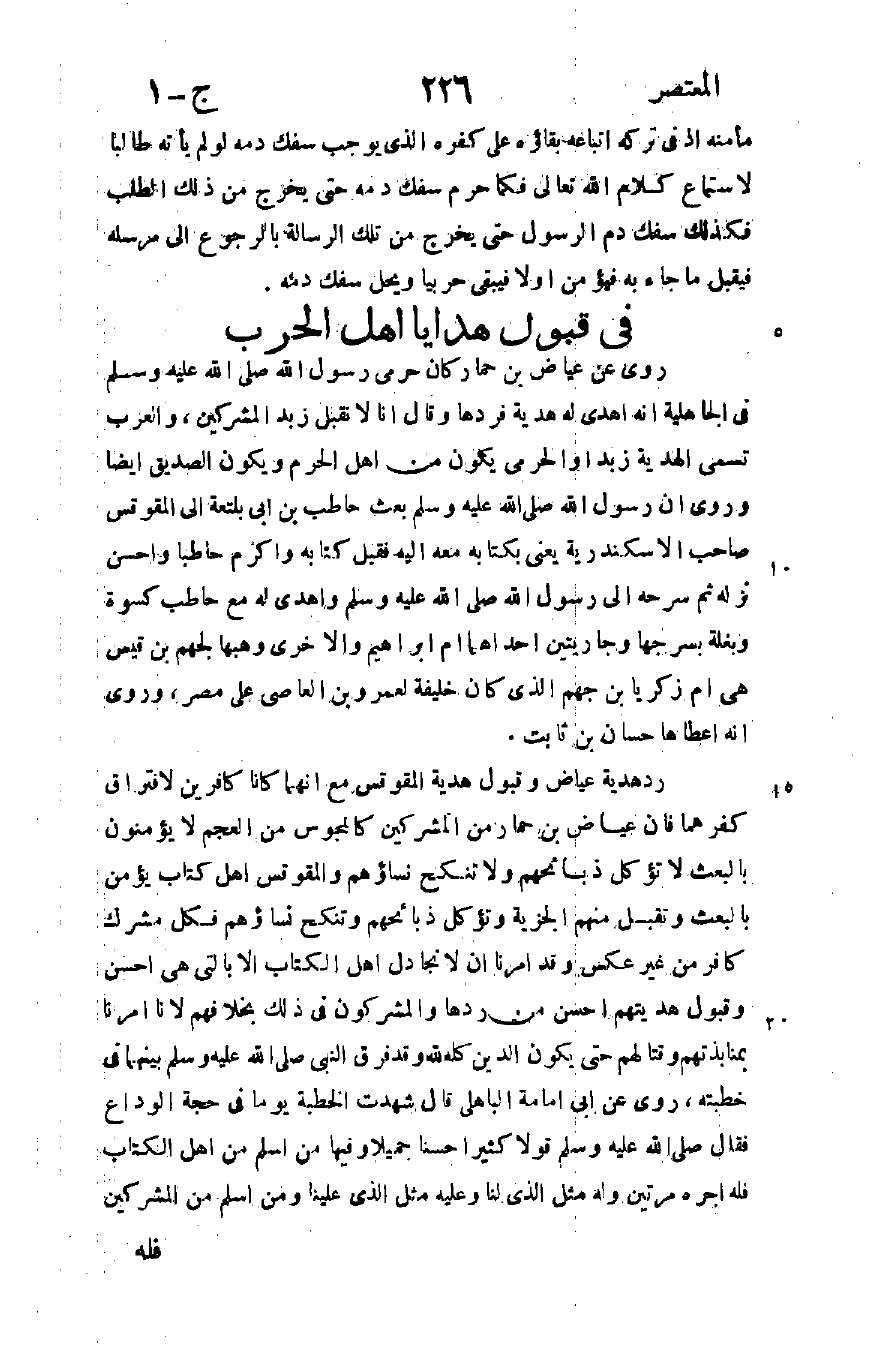 رد هدية عياض وقبول هدية المقوقس مع أنهما كانا كافرين لافتراق كفرهما فإن عياض بن حمار من المشركين كالمجوس من العجم لا يؤمنون بالبعث لا تؤكل ذبائحهم ولا تنحح نساؤهم والمقوقس أهل كتاب يؤمن بالبعث وتقبل منهم الجزية وتؤكل ذبائحهم وتنكح نساؤهم فكل مشرك كافر من غير عكس وقد أمرنا أن لا نجادل أهل الكتاب إلا بالتي هي أحسن وقبول هديتهم أحسن من ردها والمشركون في ذلك بخلافهم لأنا أمرنا بمنابذتهم وقتالهم حتى يكون الدين كله لله وقد فرق النبي صلى الله عليه وسلم بينهما في خطبته روى عن أبي أمامة الباهلي قال: شهدت الخطبة يوما في حجة الوداع فقال صلى الله عليه وسلم قولا كثيرا حسنا جميلا وفيها: "من أسلم من أهل الكتاب فله أجره مرتين وله مثل الذي لنا وعليه مثل الذي علينا ومن أسلم من المشركين
